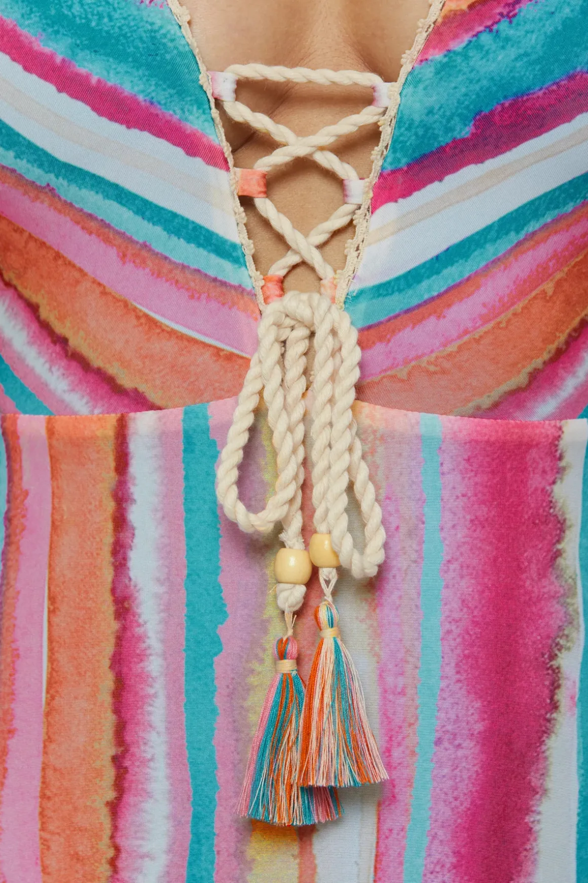 One piece swimsuit features a plunging neckline withtwisted cord lace-up ties, accented by multicolored tassels and wooden beads and delicate picot trim. Offers crossback adjustable straps and moderate bottomcoverage.