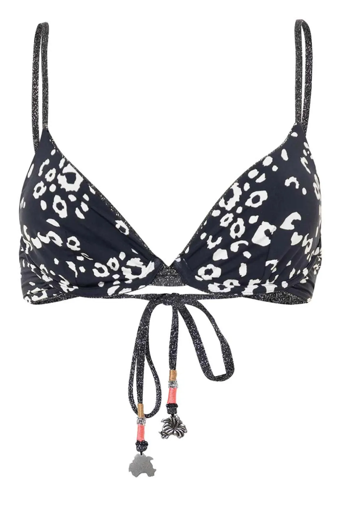 Dainty bikini top features a metallic fabric with a reversible animal print and offers supportive underwire and adjustable lace up back ties.