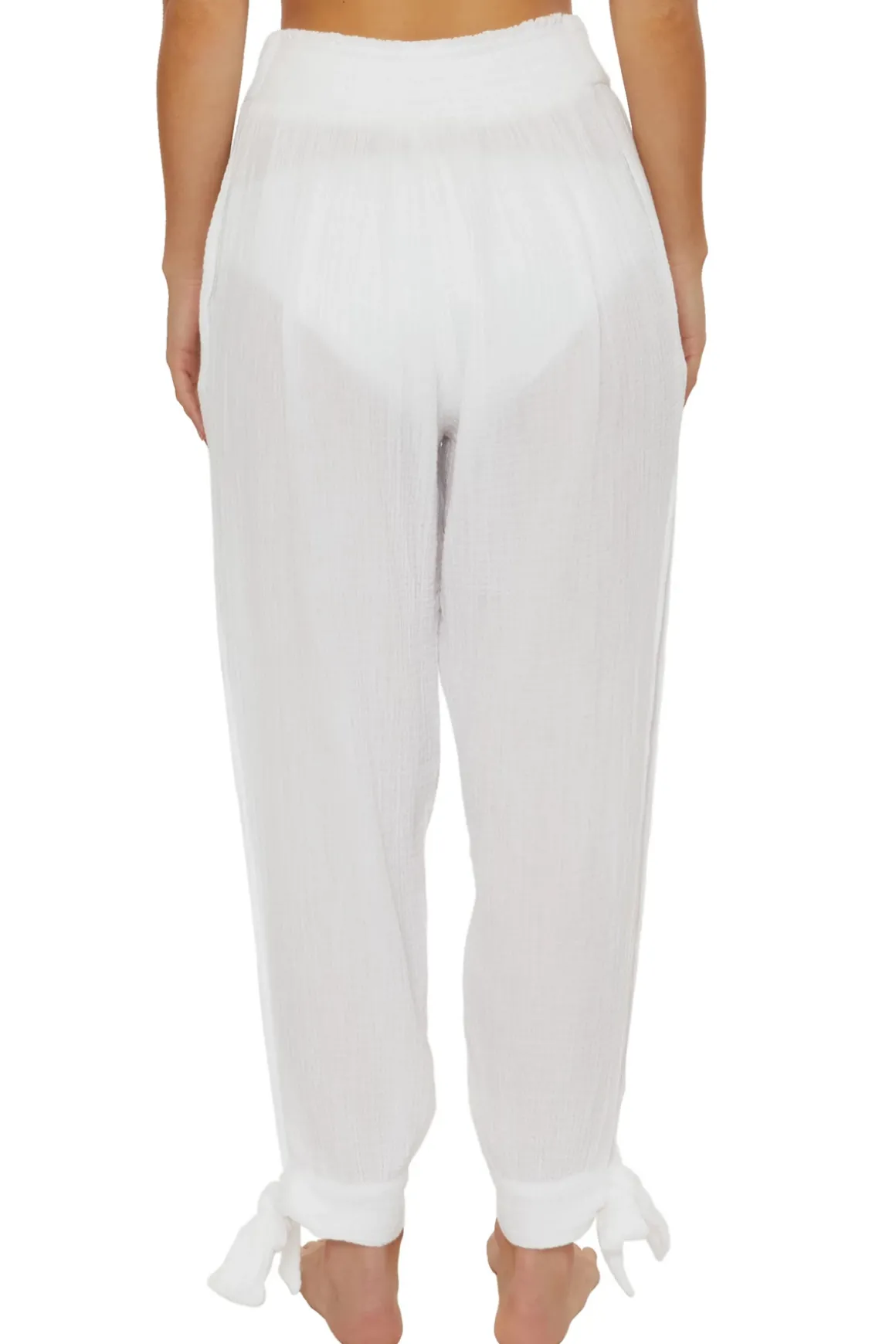 Daydreamer pants feature a smocked back waist, side leg slits with tie cuffs, and offer pockets.