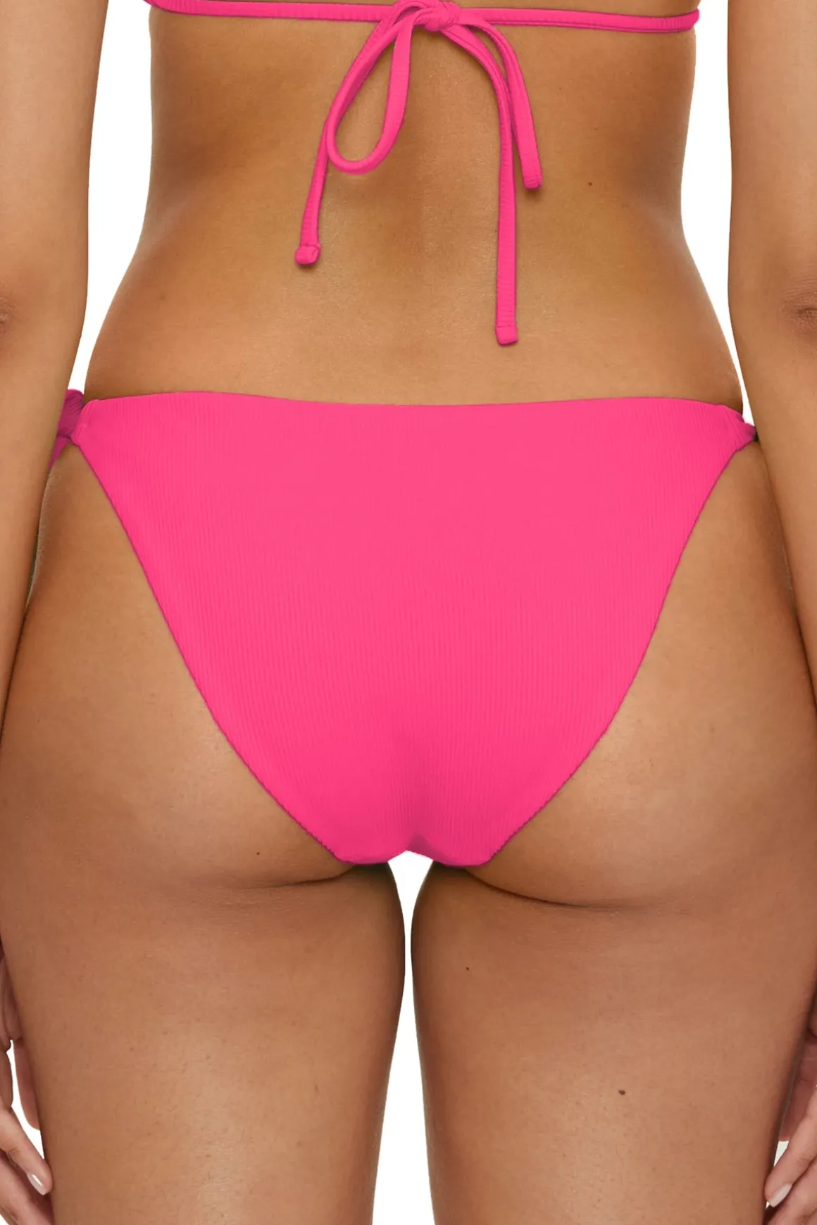 Semi bikini bottom features fine ribbed texture and geometric cut-out details. Offers adjustable tie sides and moderate coverage.