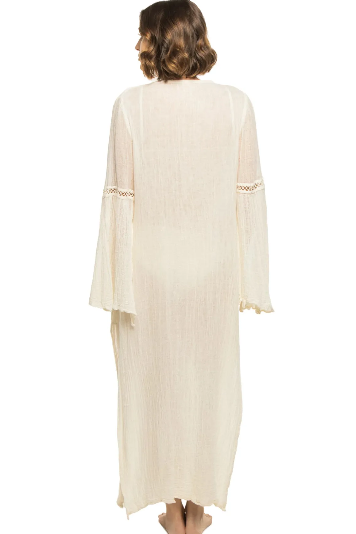 Dominga maxi dress captivates with its alluring plunging neckline, delicate lace detailing, and elegantly long split sleeves.
