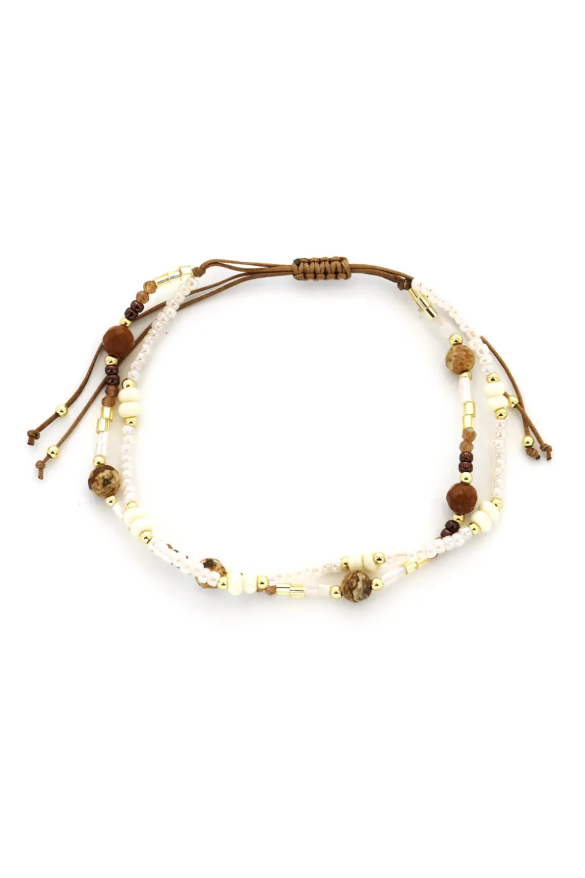 Bracelet features a gold-plated brass chain, jasper stone, seed beads, and cotton-blend thread.