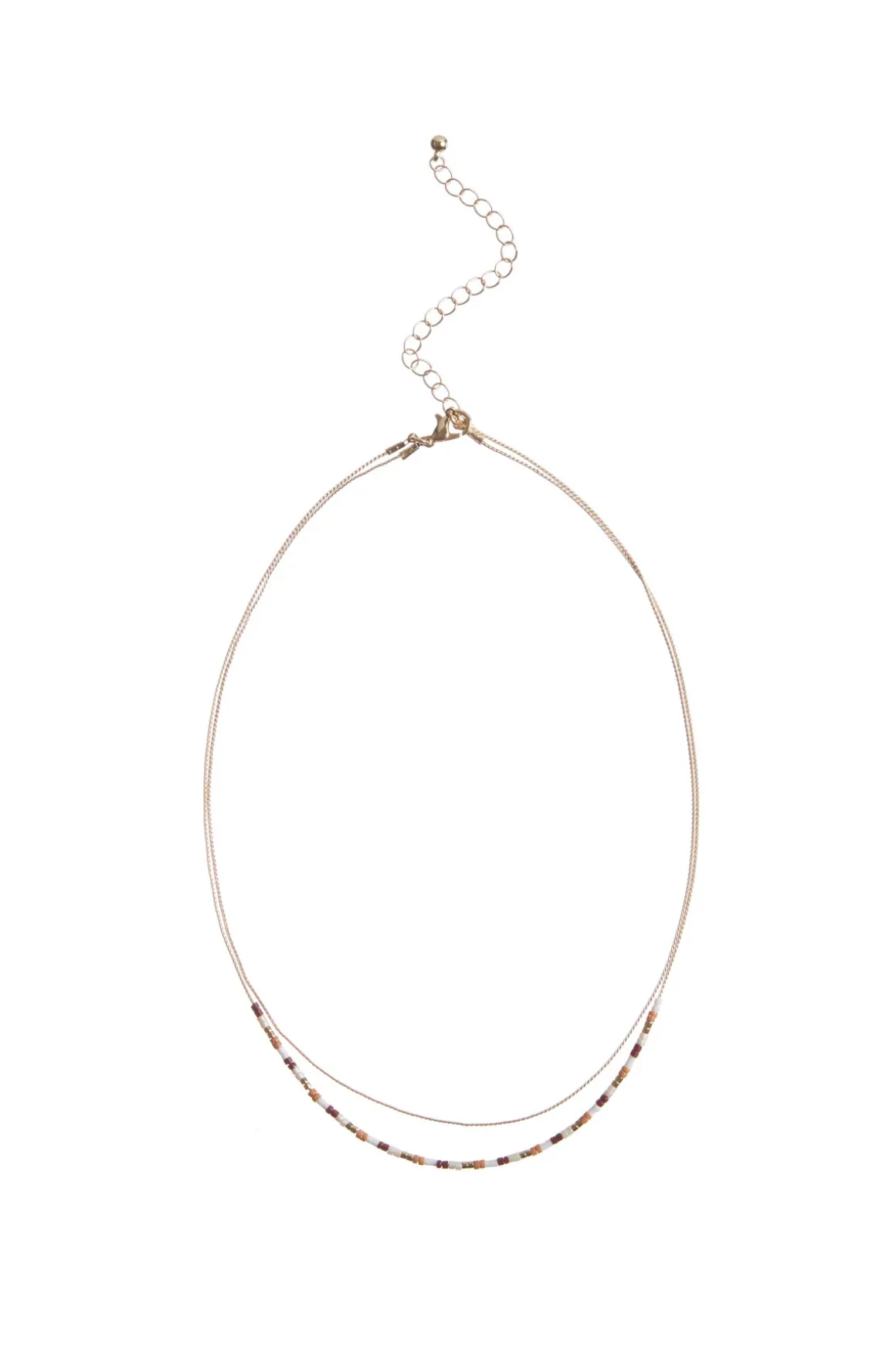 Necklace features two layered chains one with multi-colored beading and offers an adjustable lobster clasp closure.