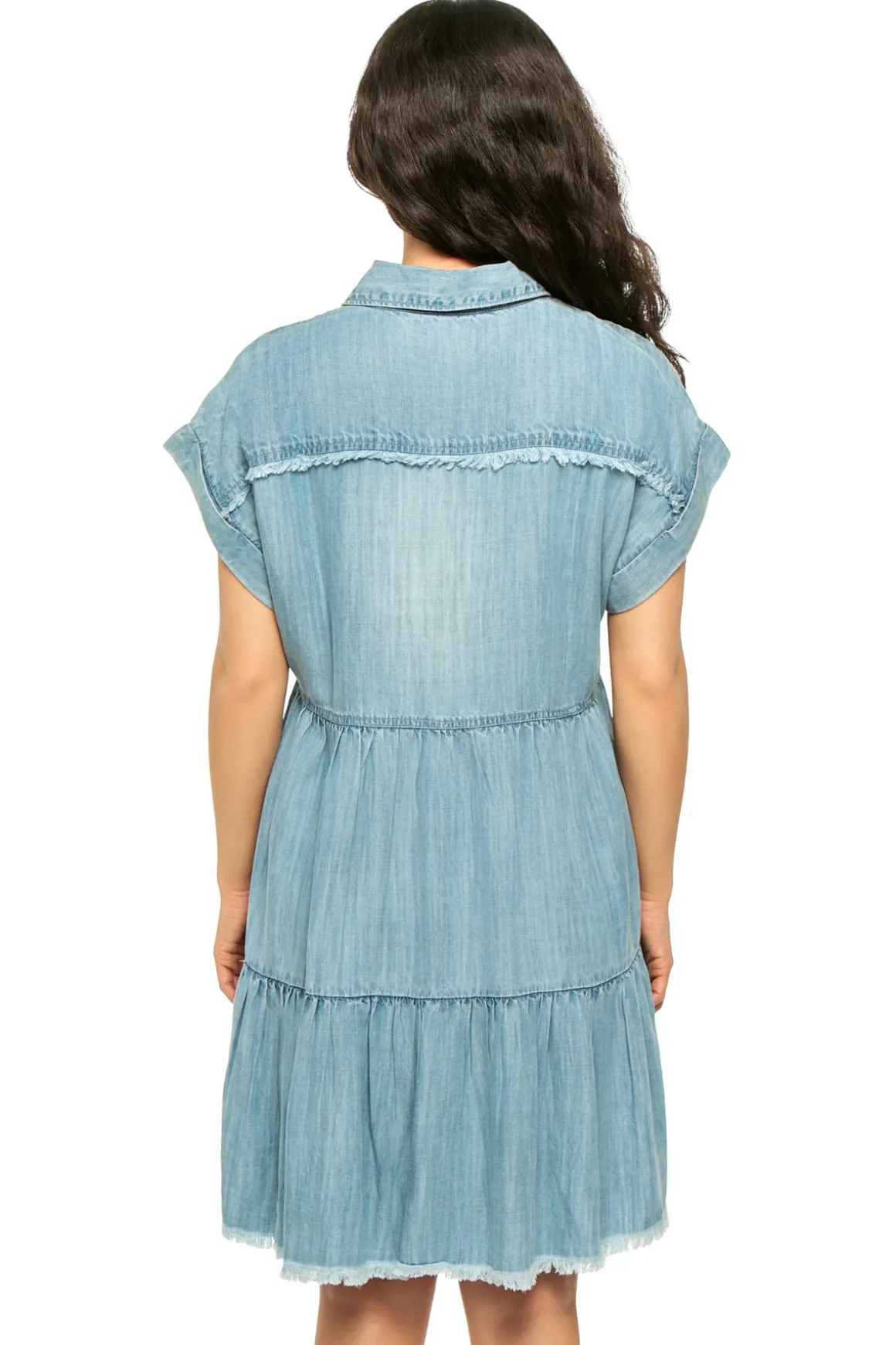 Dress shirt featuring a collared neckline, button-up front, short sleeves, and a frayed hem.