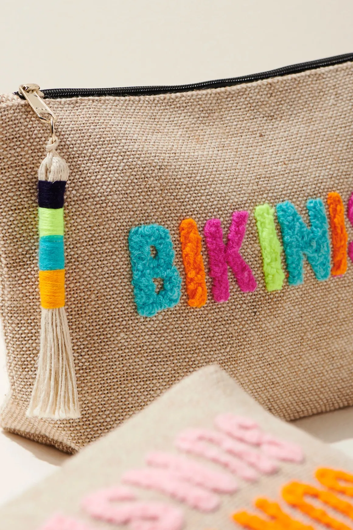 Pouch features a bold embroidered graphic reading ‘Bikinis’ and a zipper closure adorned with a tassel detail.