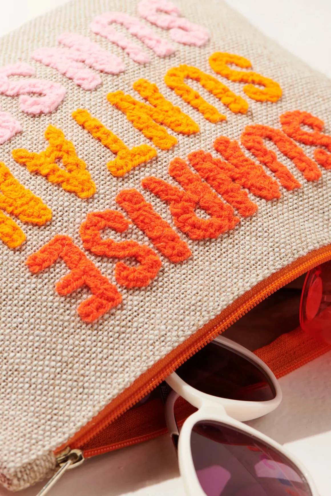 Pouch features a bold embroidered graphic reading ‘Sunrise, Suntan, Sunset’ and a zipper closure adorned with a tassel detail.