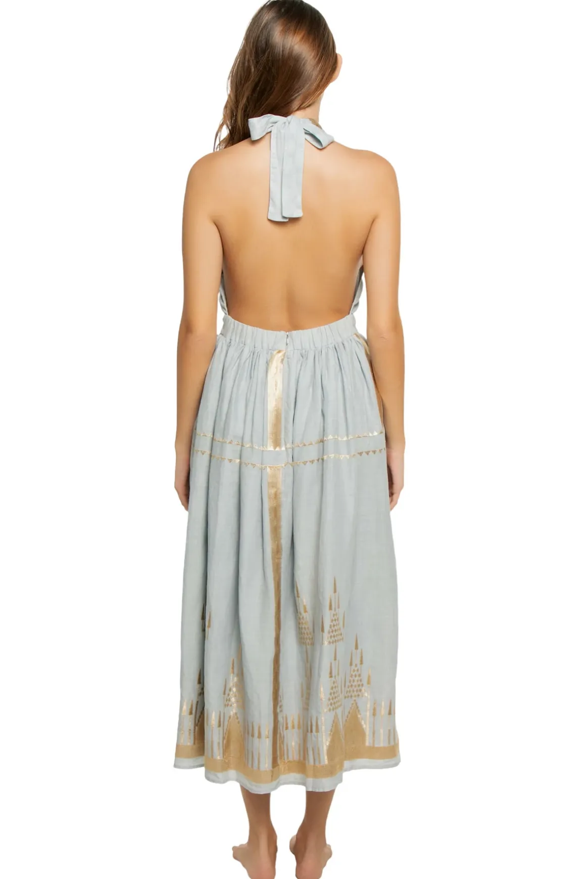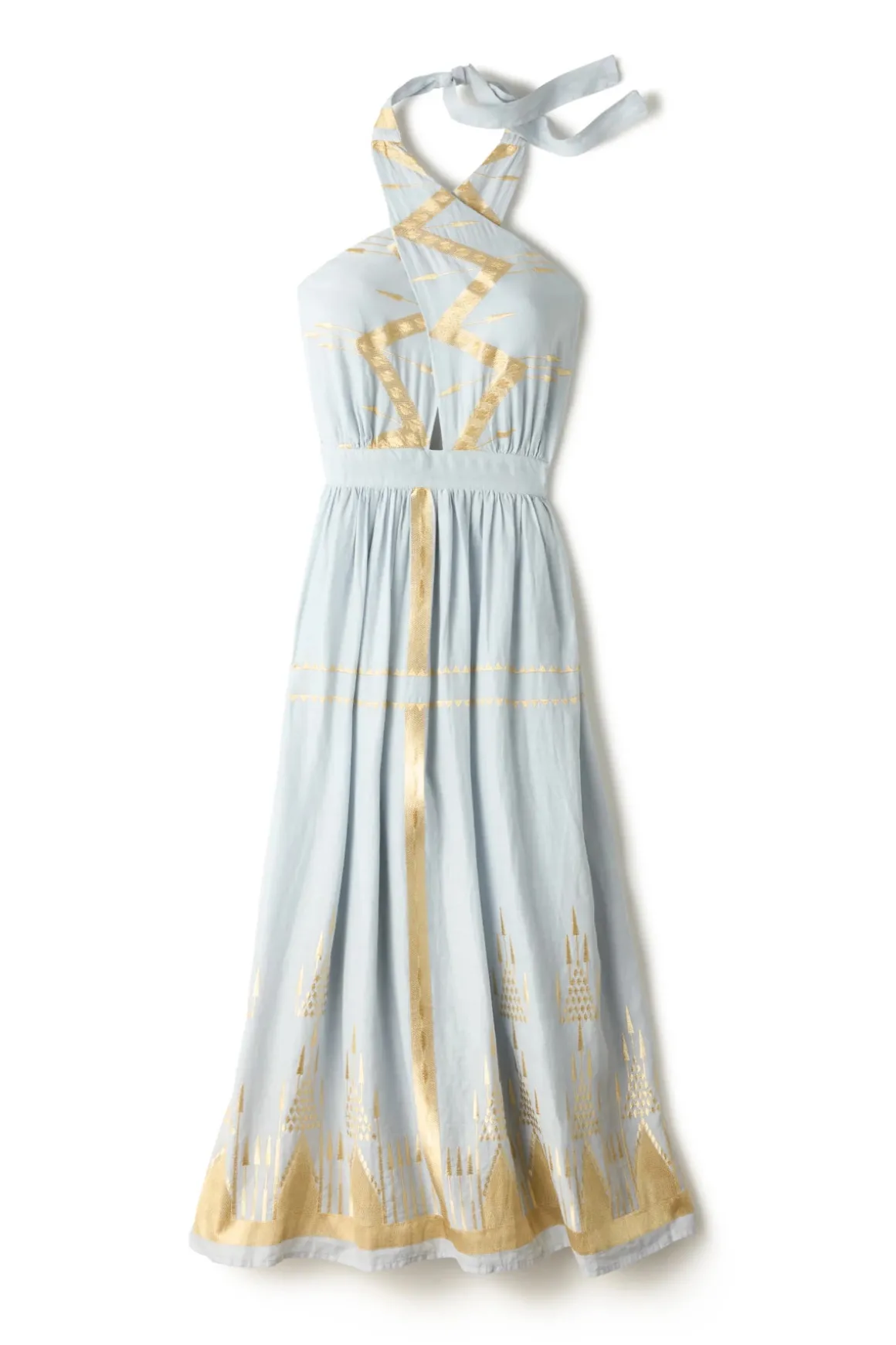 Maxi dress features gold embroidery, a high neck design and crossover draped front. Offers adjustable halter ties.