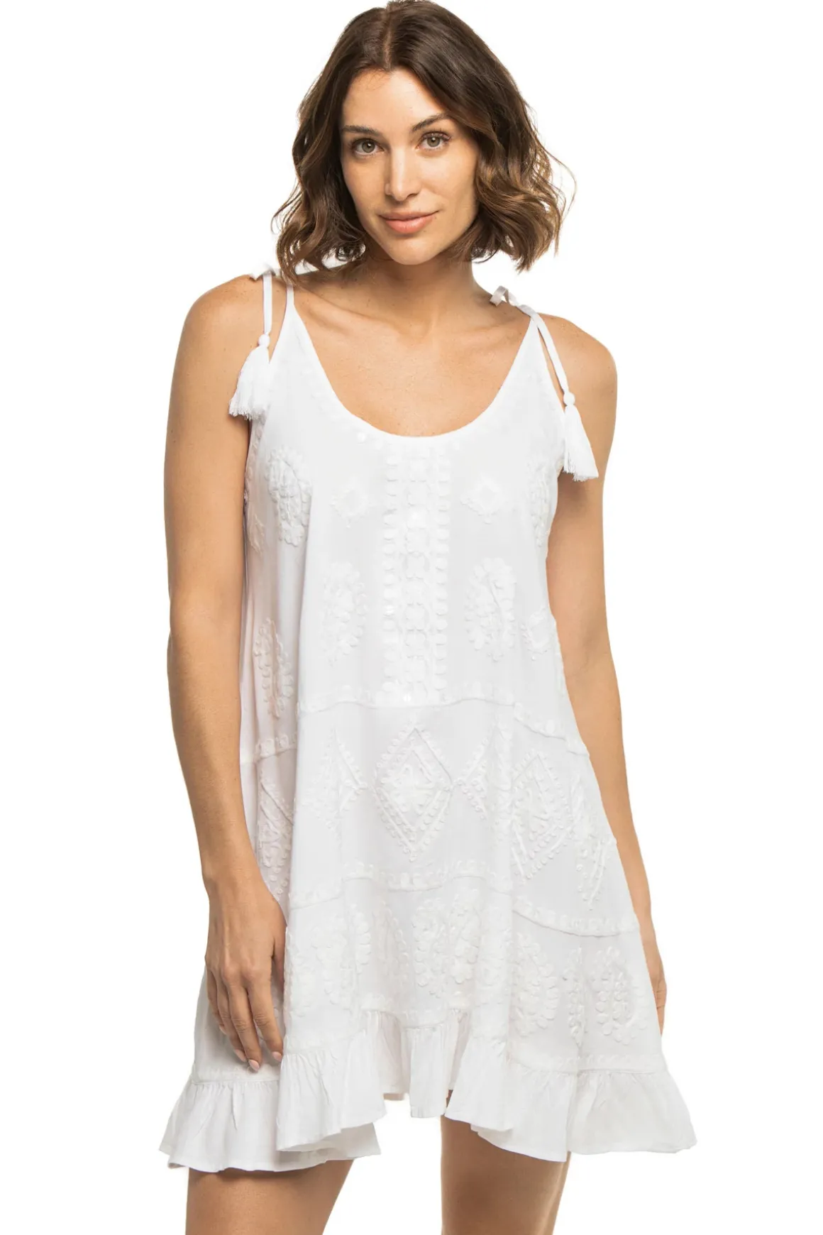 Mini dress features embroidered details, a charming ruffle hem, and adjustable shoulder straps adorned with tassel accents.