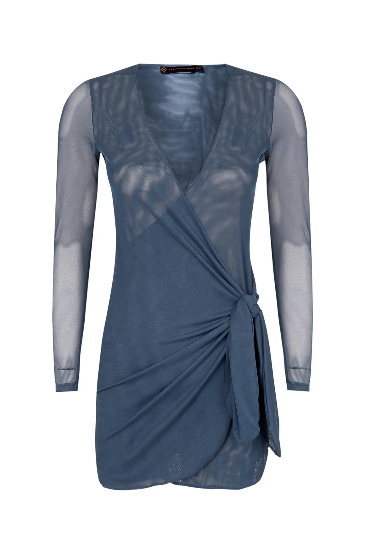 Emily mini dress features deep v-neckline, long sleeves, and a chic knot accent at the hip for added flair.