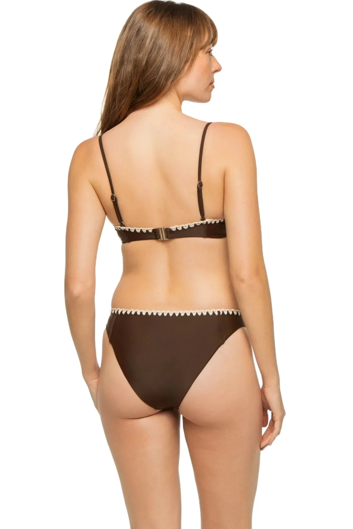 Emmeline bikini top features beautiful crochet trim and offers supportive underwire, adjustable straps, and a hook closure.