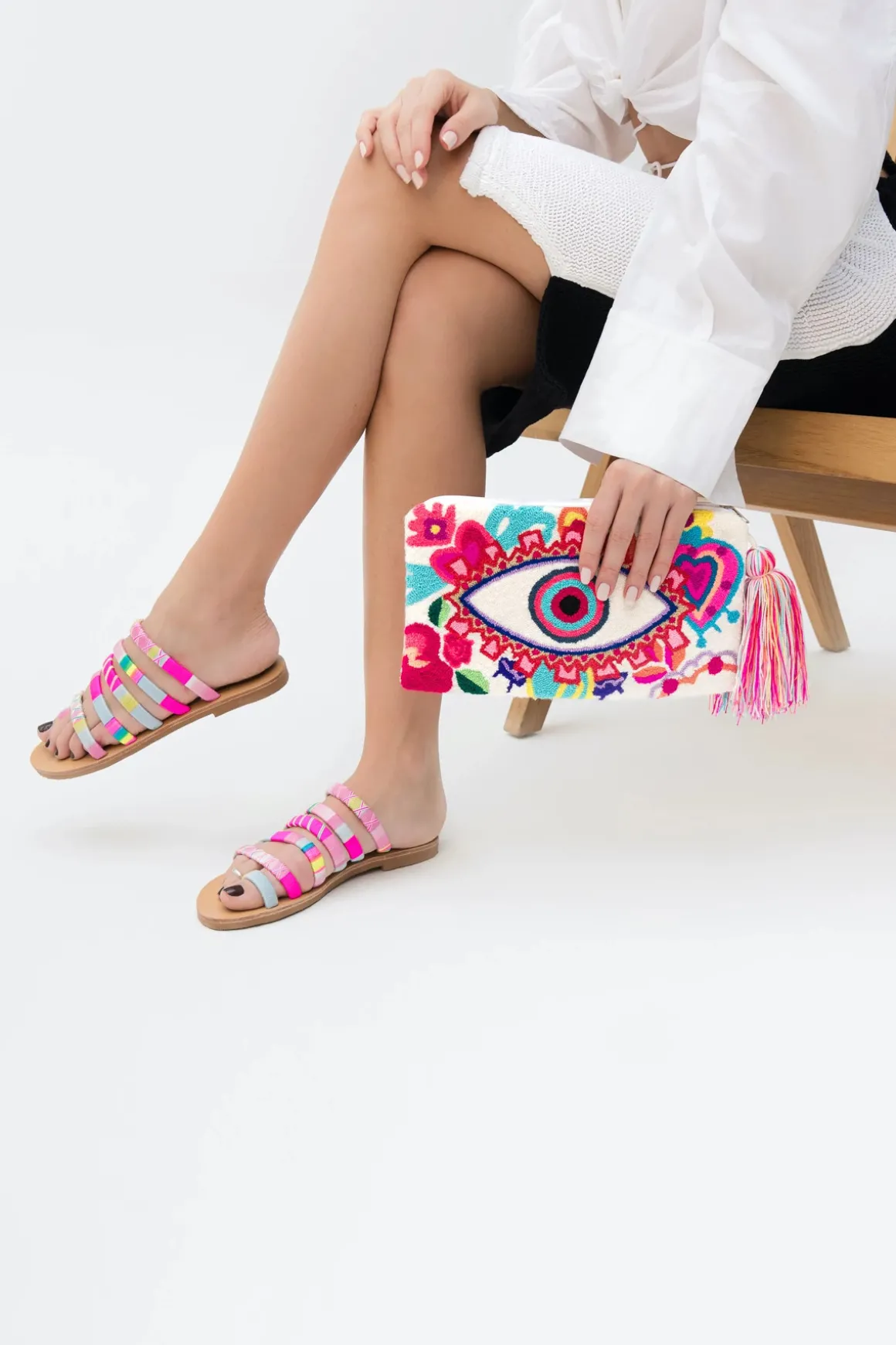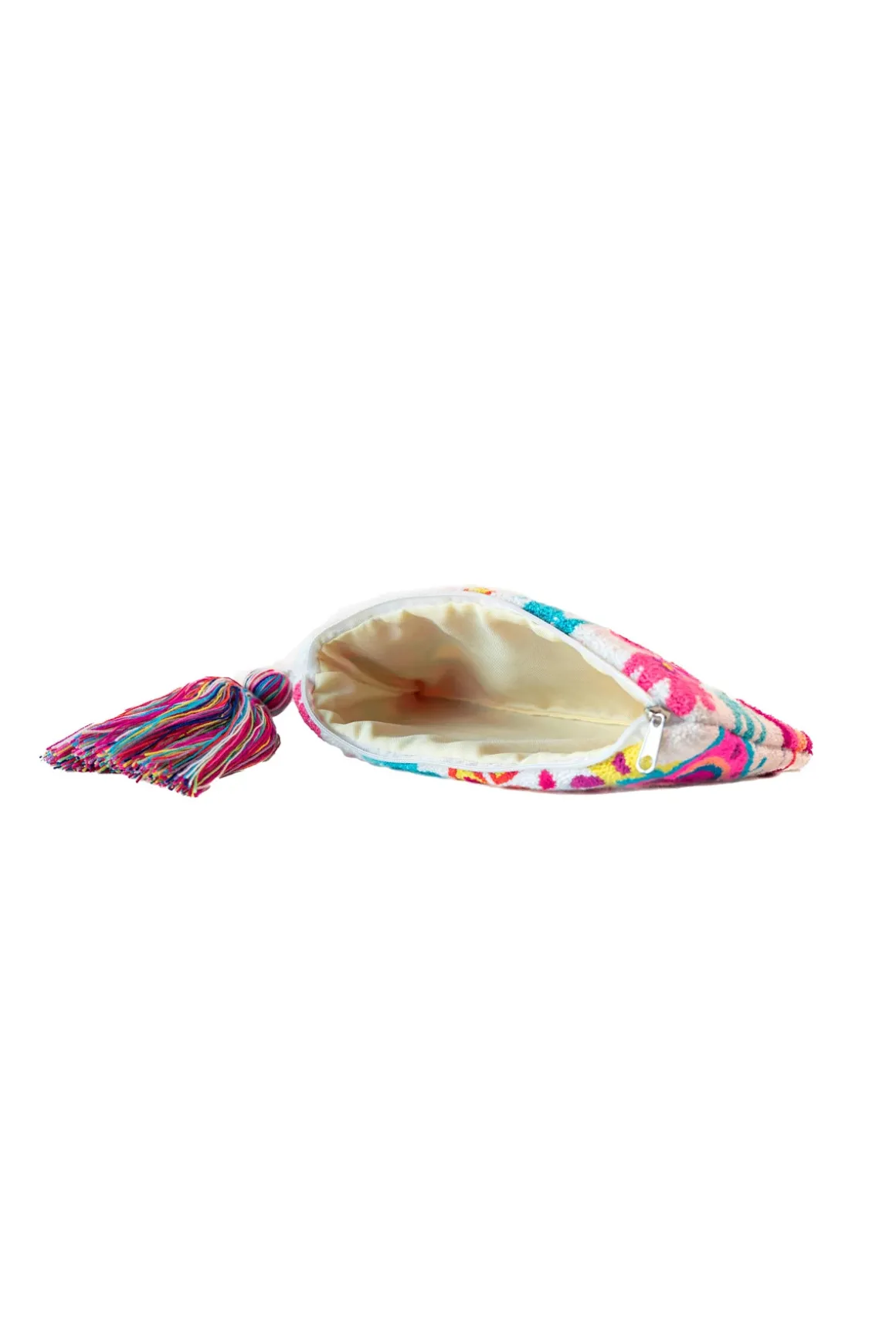 Clutch is crafted by talented Colombian artisans, features an eye-catching evil eye design and a zipper closure adorned with a tassel detail.