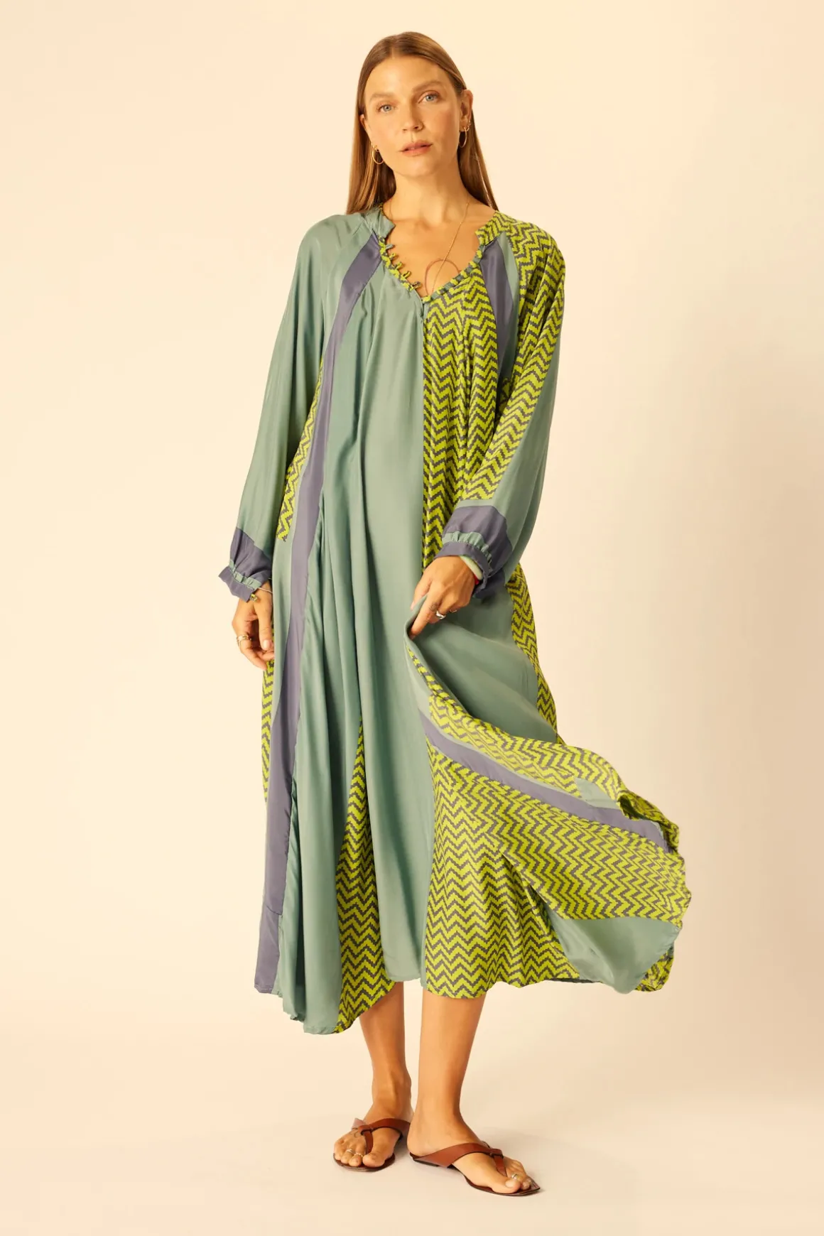 Fiore A-line maxi dress features v-neckline with covered buttons and voluminous long sleeves.