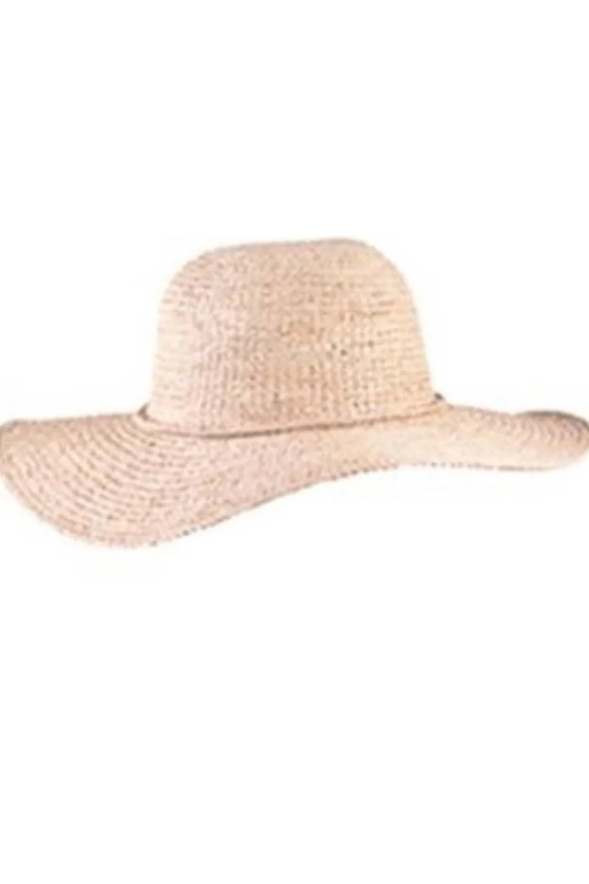 Raffia wide brim sun hat with interior sweatband and adjustable tie.