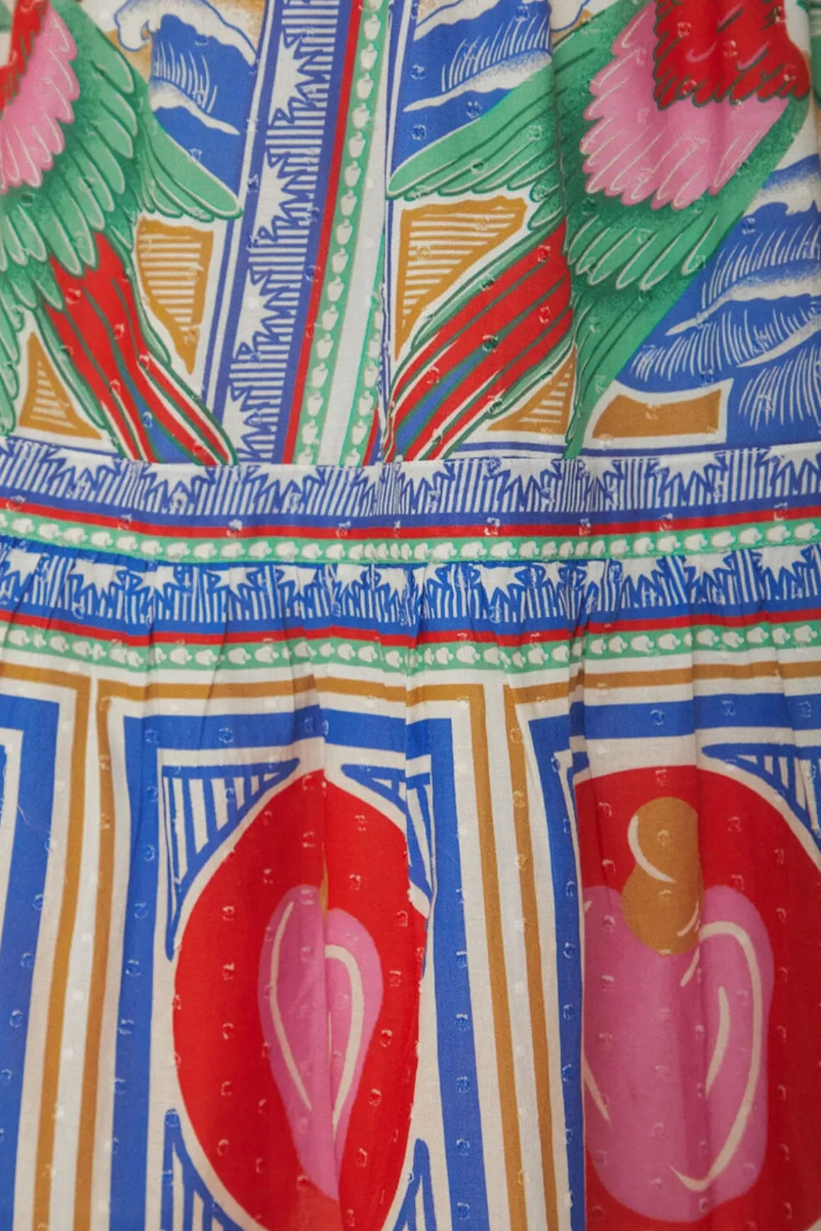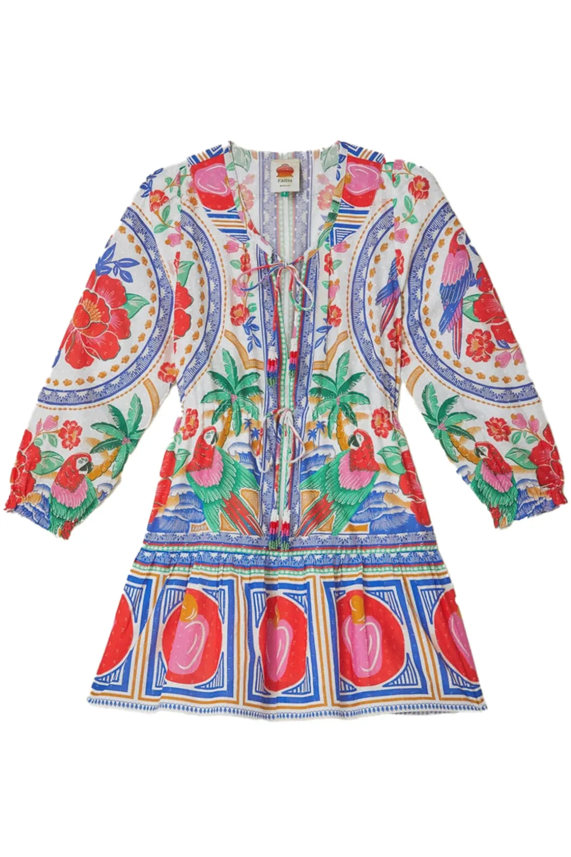 Mini dress features a bold tropical floral design, round neckline, and soft bell sleeves with a ruffled hem. Offers a cinched waist with drawstring ties.