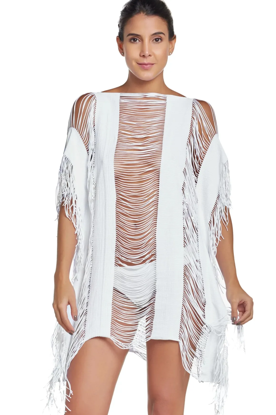 Fringe cover tunic with high neck and handkerchief hem.