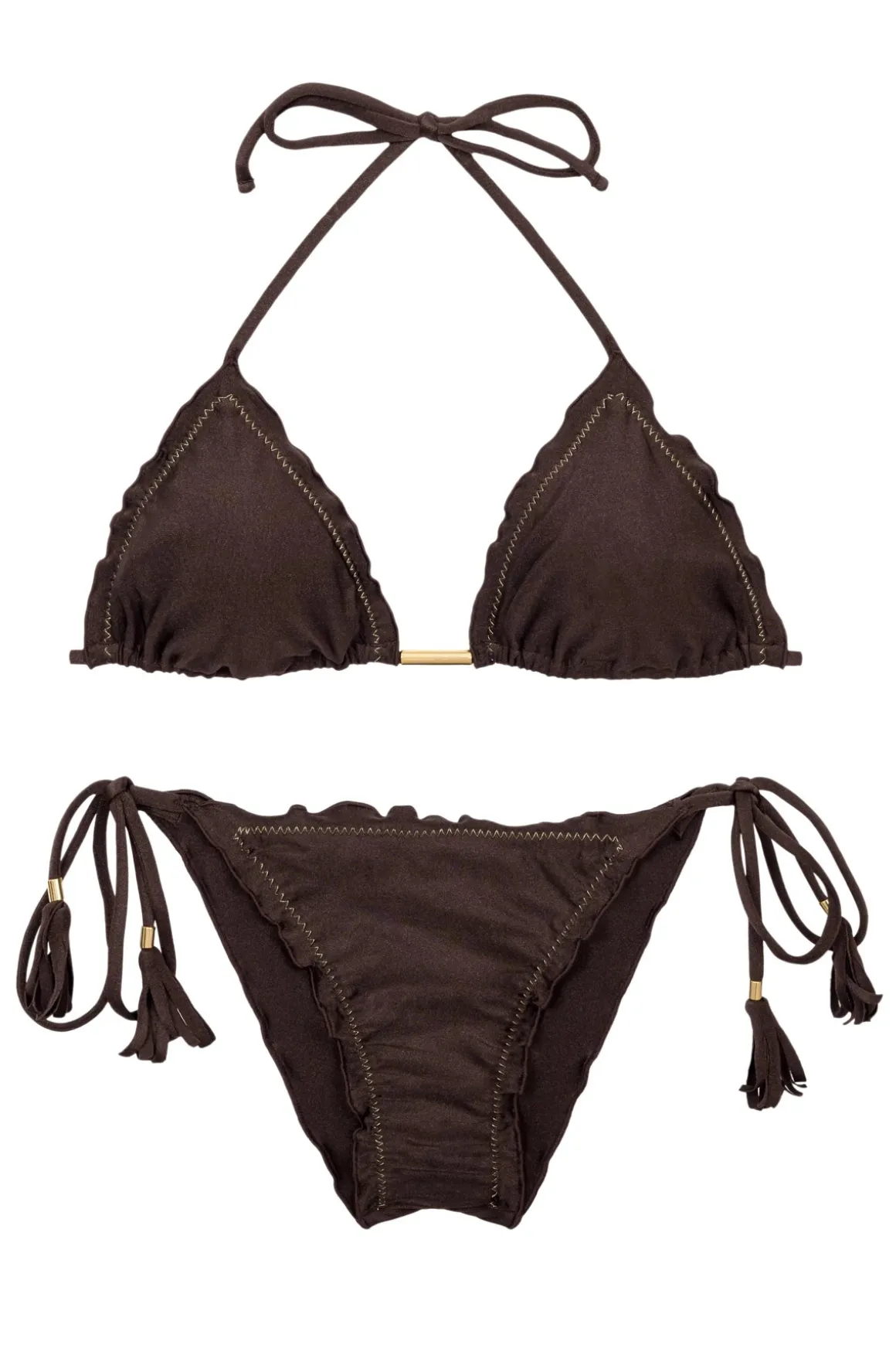 Frufru shimmer bikini bottom with gold stitching and gold hardware, offers adjustable tassel tie sides and minimal bottom coverage.