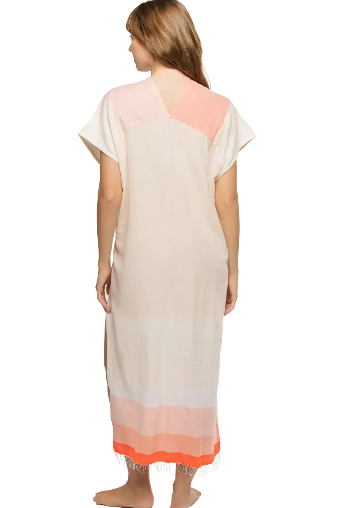 Gasira caftan features hand-woven Ethiopian cotton with a v neckline, kimono cap sleeves, and a gathered waist.