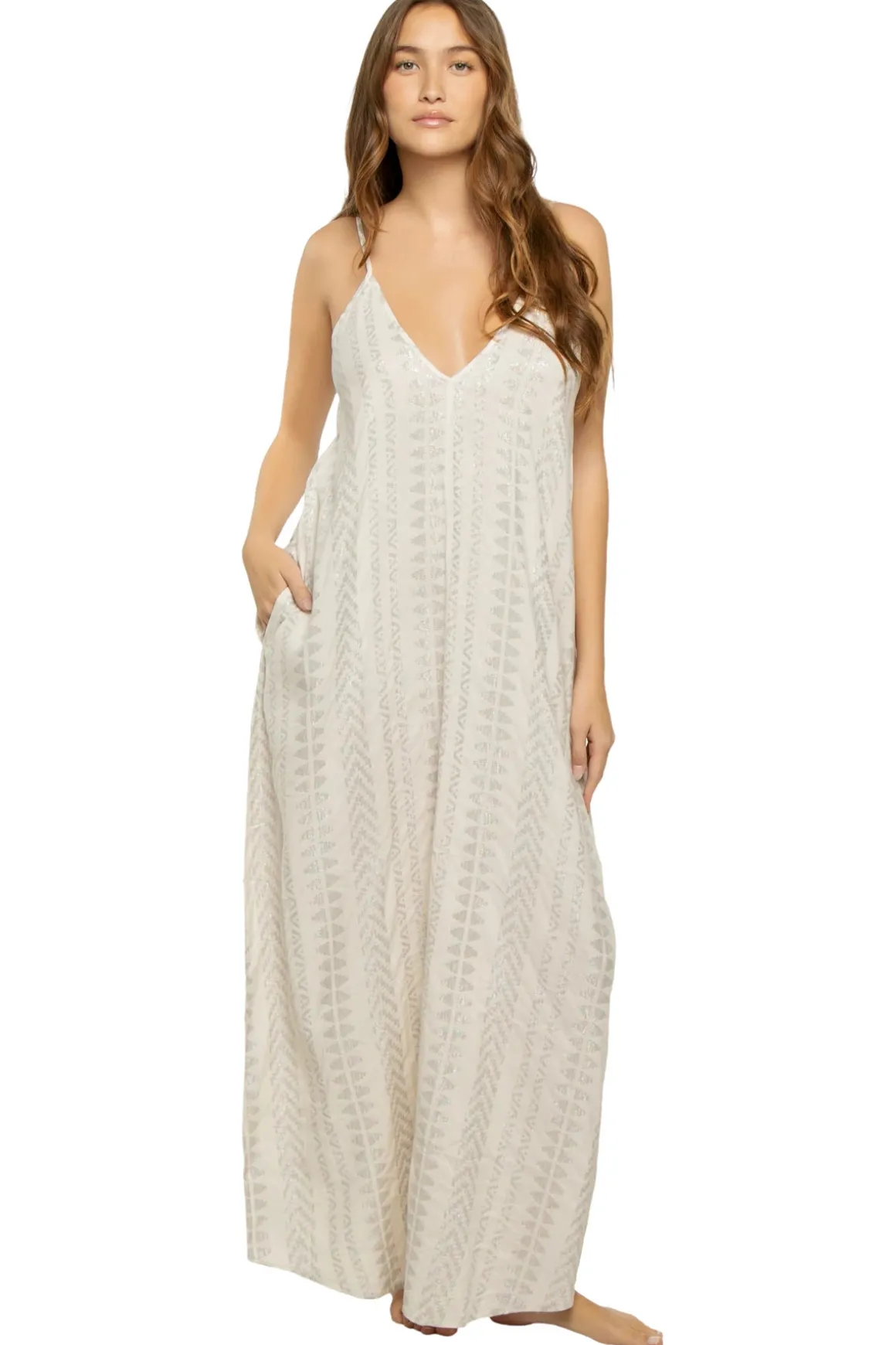 Maxi dress features a flattering deep v-neckline with geometric metallic design. Offers thin adjustable over the shoulder straps with a v-cut back.