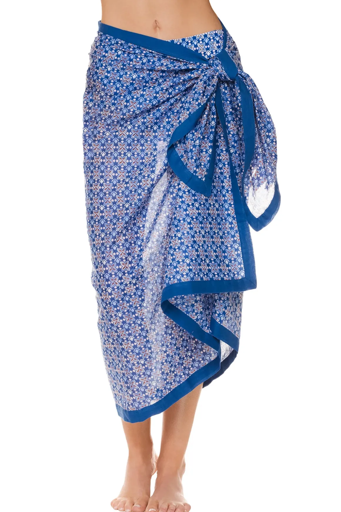 Pareo features a geometric tile print framed by a bold solid border and can be styled in multiple ways.