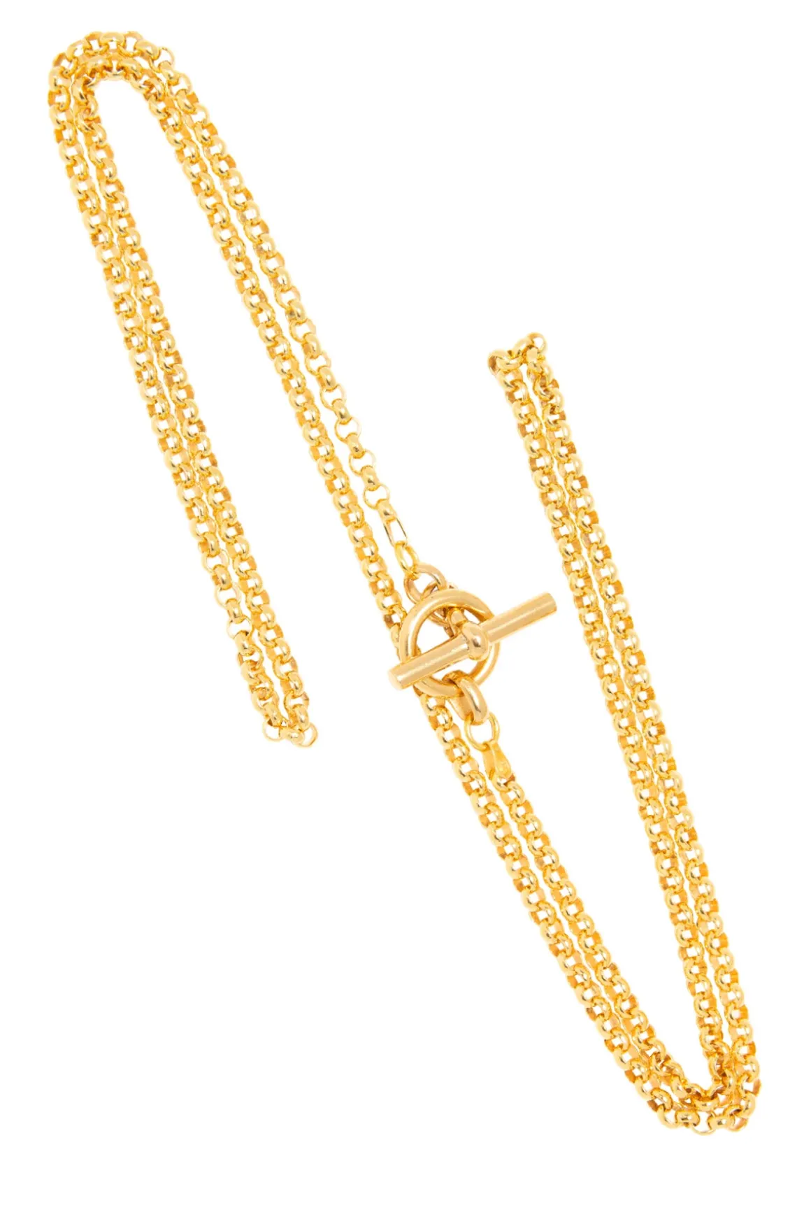 Gold lariat necklace takes a clean, modern twist on a traditional style with a t-bar pendant. Chain can be wrapped around the neck twice or worn loosely.