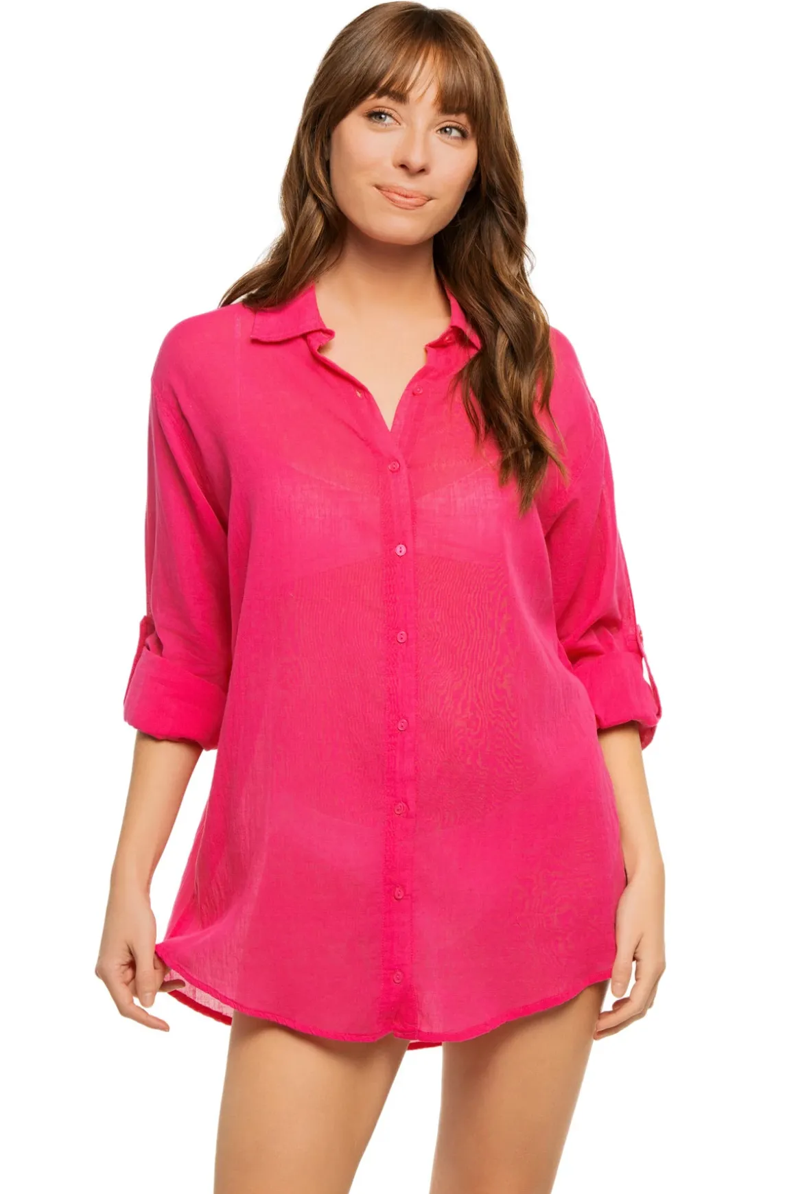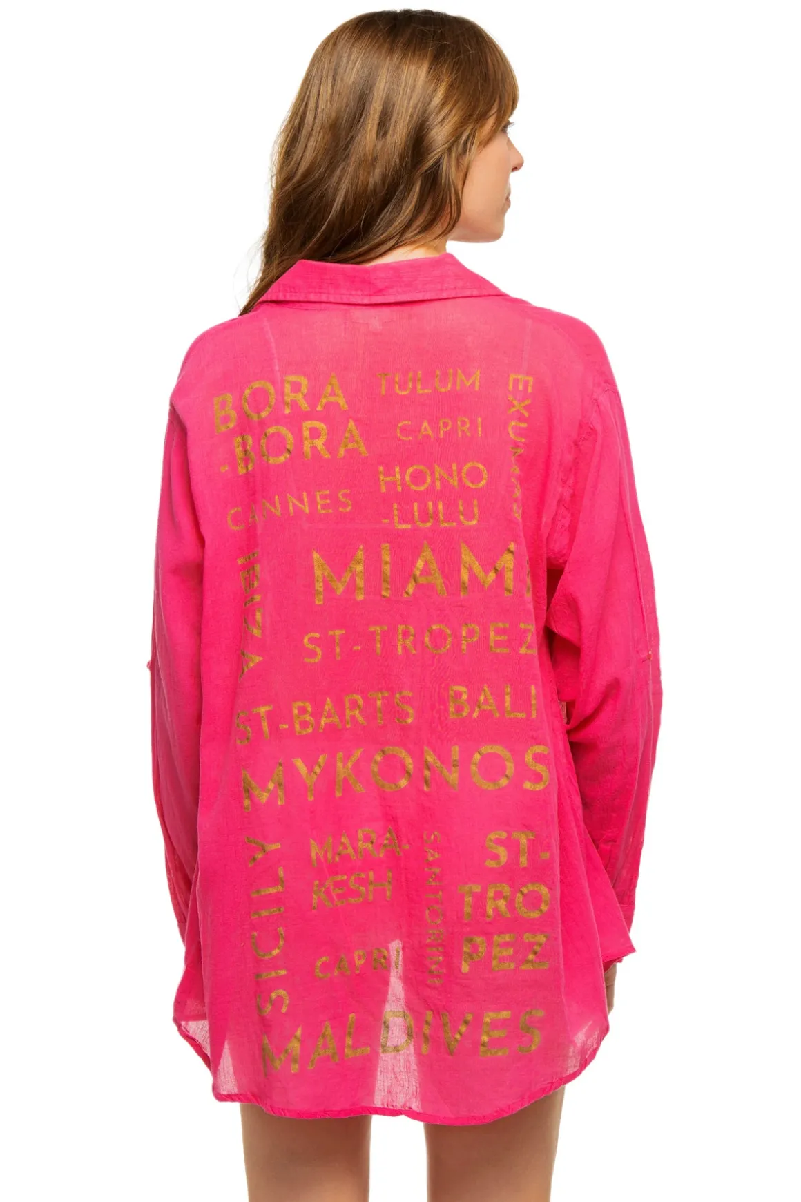 Shirt dress features a button up front, long sleeves and printed destinations graphic on back.
