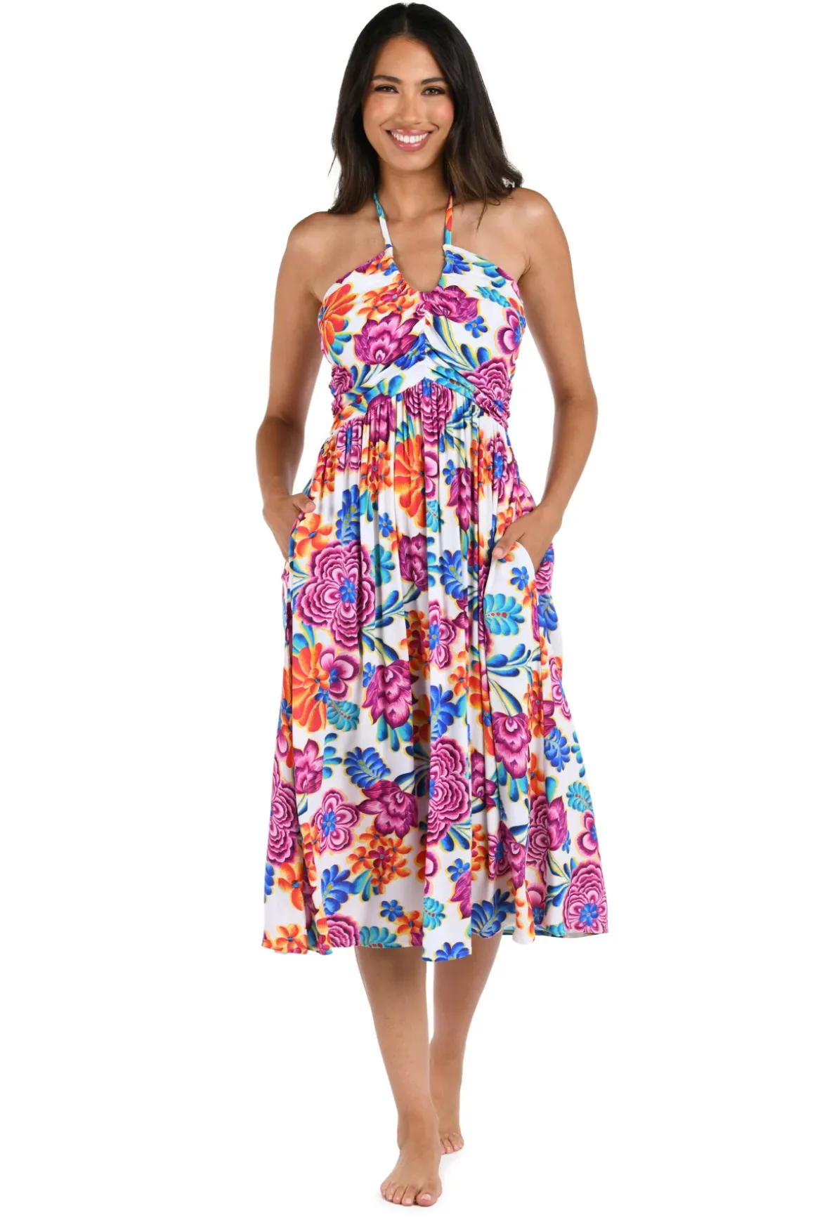 Midi dress features v-neckline, shirred front, and back smocking. Offers adjustable halter straps with tassels and convenient pockets.