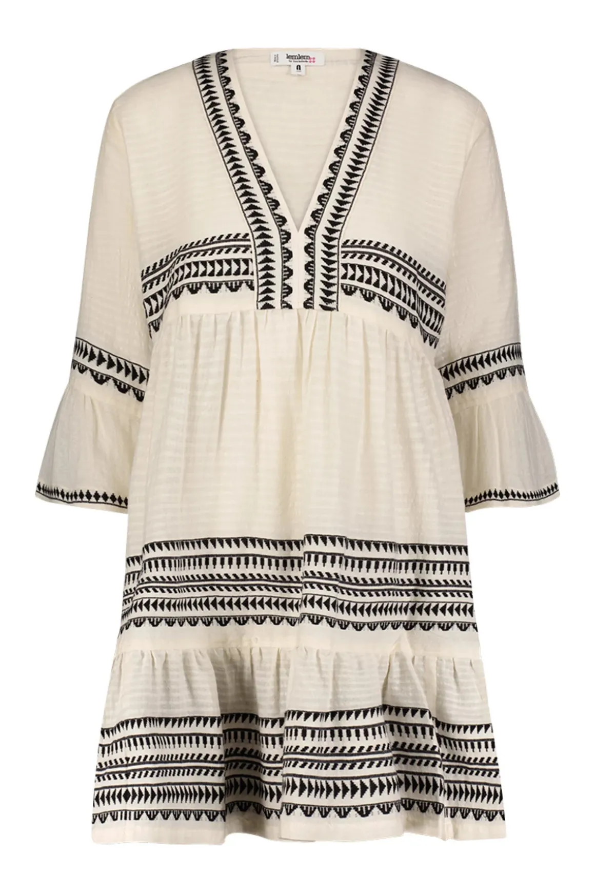 Hanna mini dress features intricate Tibeb bands, a deep v-neckline, three-quarter bell sleeves and a tiered ruffled hem.