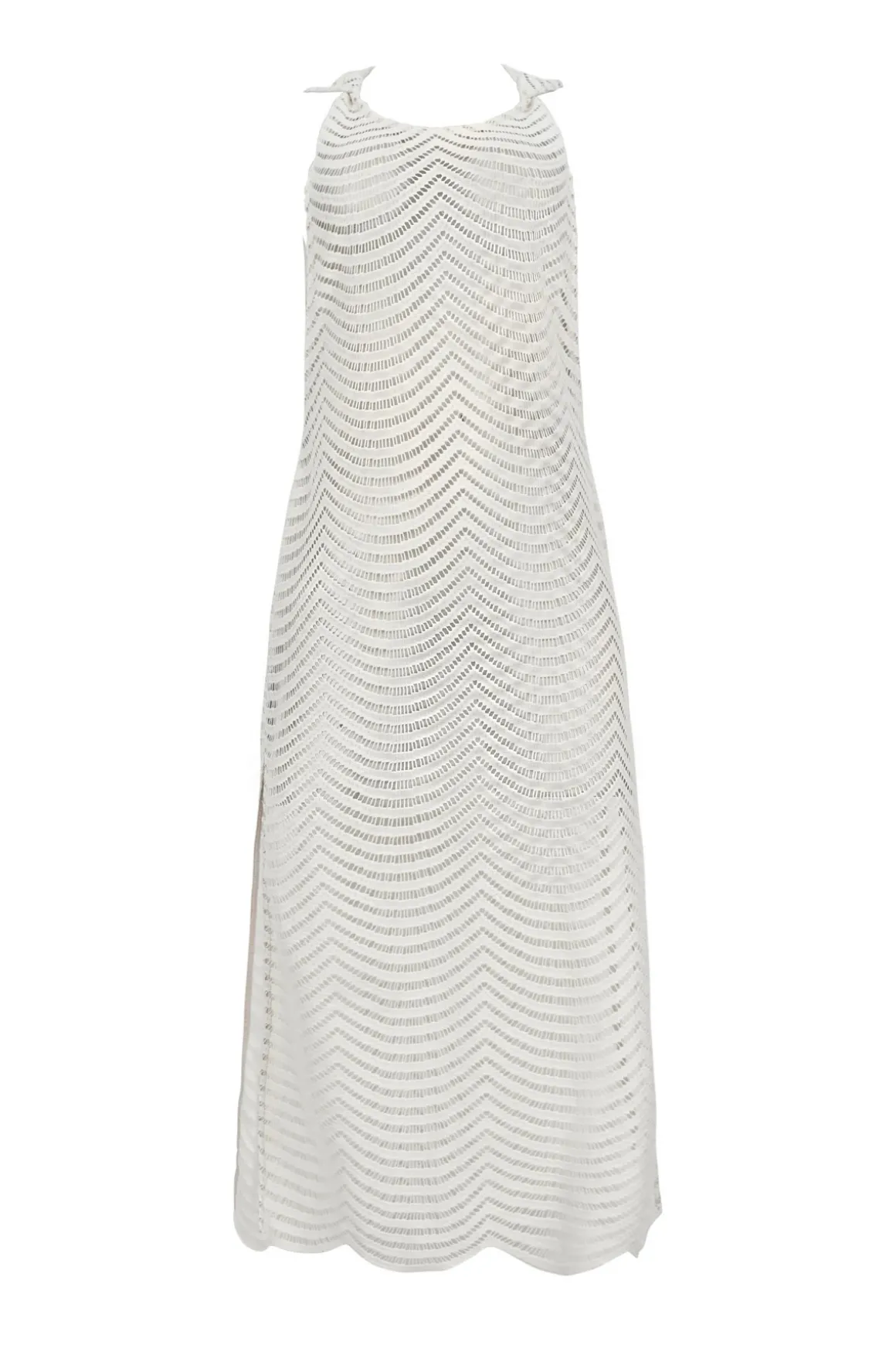 Harbor midi dress features a textured doily fabric and side slits.