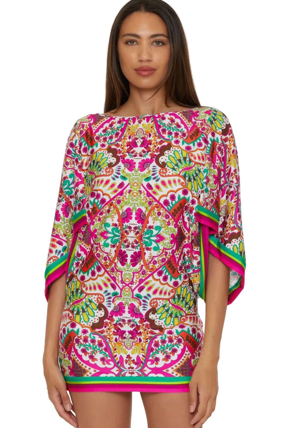 Tunic features bright floral print trimmed with contrasting horizontal stripes, flounce sleeves and is fitted at hips. Can be worn as a swim cover up, a mini dress or as a top.