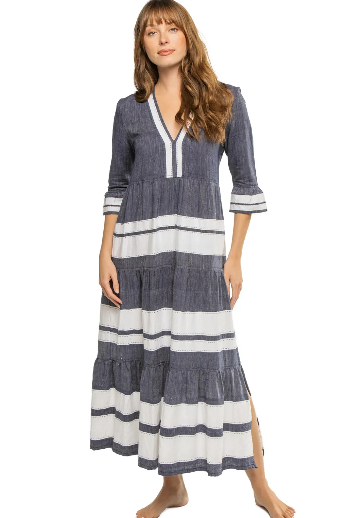 Hawi maxi dress is made of soft hand spun cotton with pick stitch edging.Features a deep v-neckline, three-quarter bell sleeves and a tiered ruffle hem.