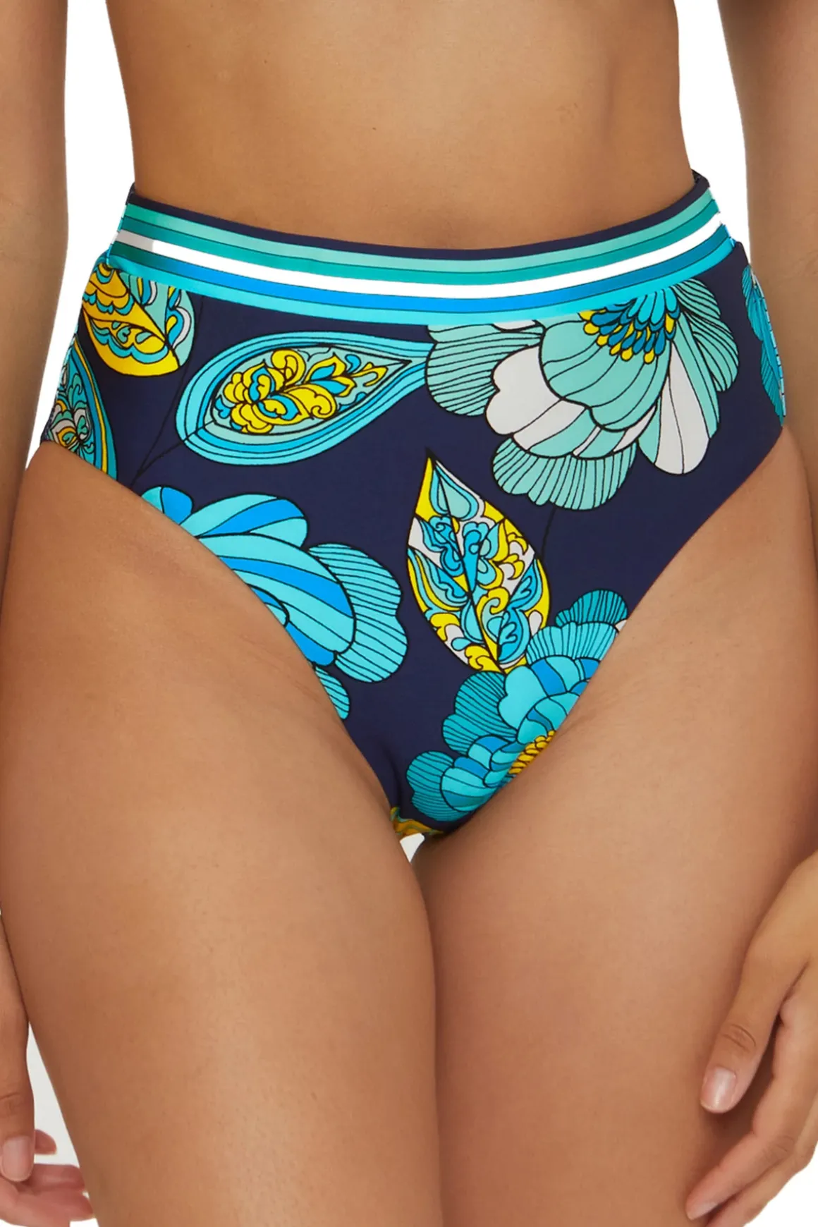 Bikini bottom features a floral print and offers high cut leg and moderate bottom coverage.