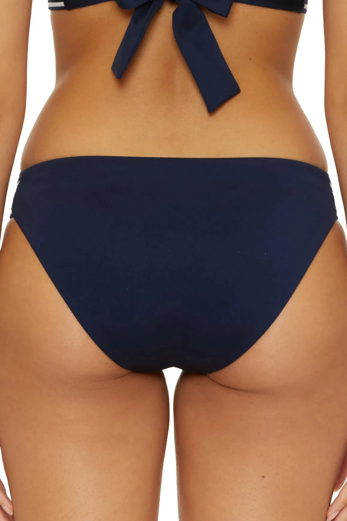 Hipster bikini bottom features contrasting tab sides and offers moderate coverage.