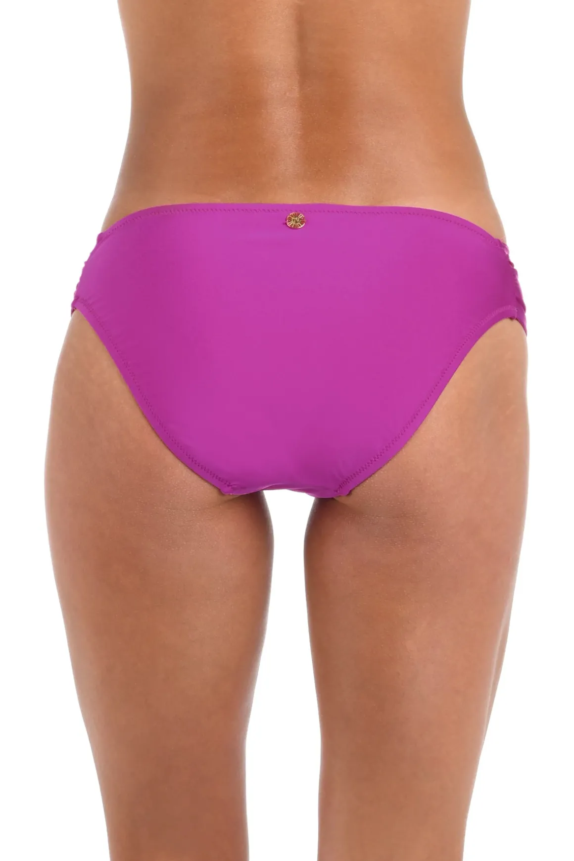 Hipster bikini bottom features shirred tab sides and offers moderate coverage.