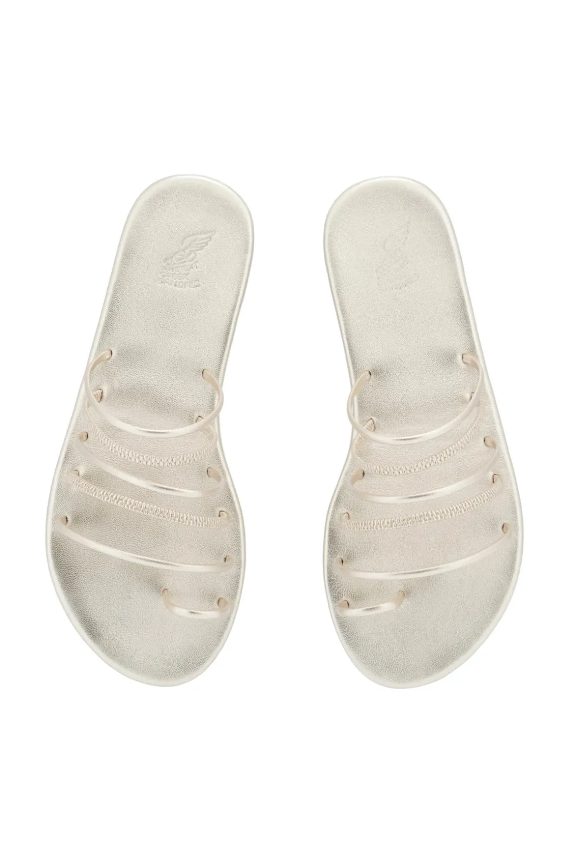Imatio slides feature thin metallic straps, perfect for beach outings or elegant occasions. Handmade in Greece.