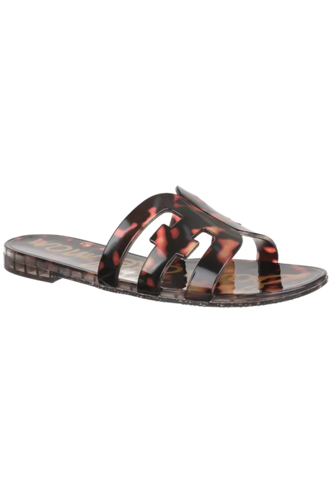 Irina slide features the brands signature double-E logo, PVC footbed, a jelly sole and a slightly elevated heel.