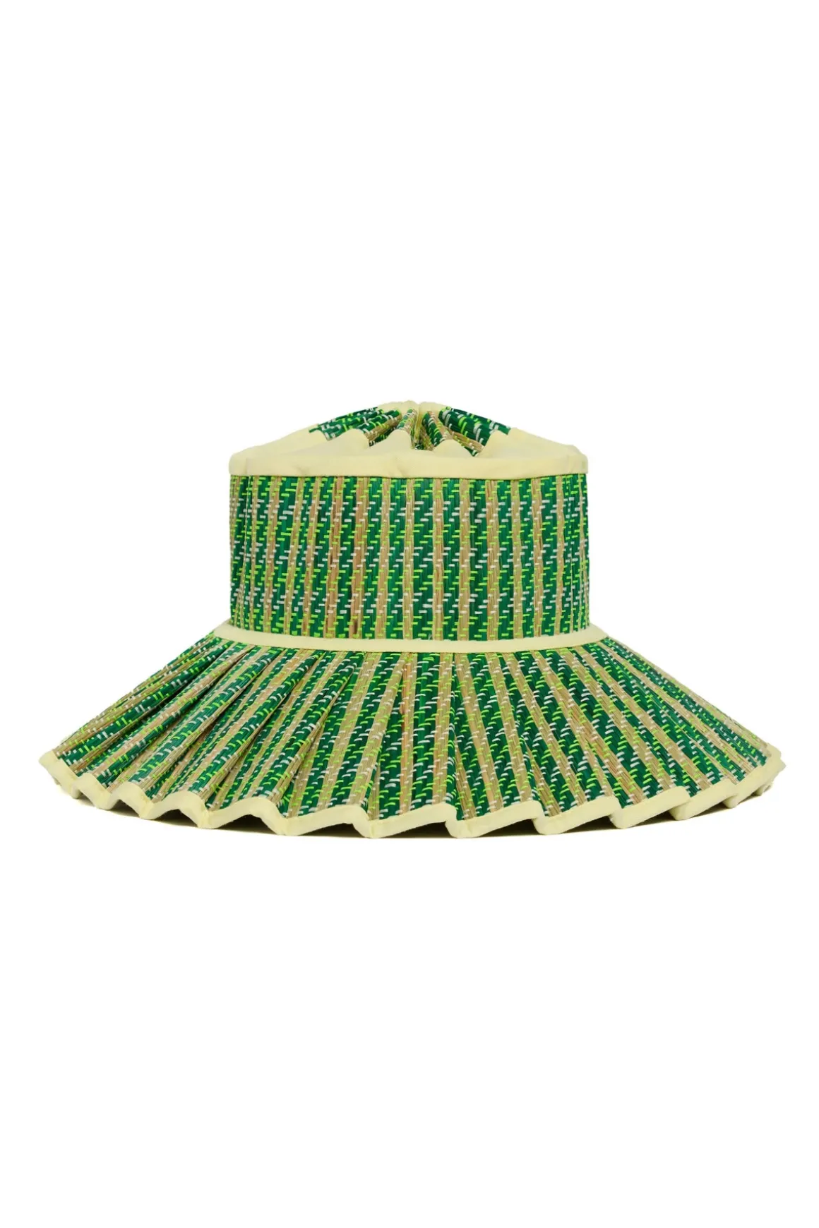 Island Capri sun hat features a mid-length brim, is carefully handcrafted from 100% Natural Organic Grass Fibers, and is specifically designed to collapse and fold like origami due to the sunray pleats for easy packing and traveling. Offers optional ties that are provided at the base of each hat to be used for anchoring during breezes. Island Capri features alternating thread colors woven through its hand-dyed fiber base, with fabric trimming.