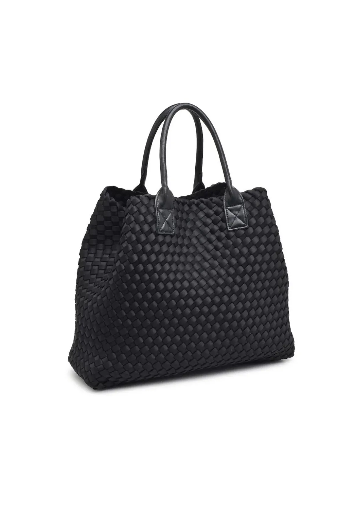 Ithaca tote is crafted from woven material and features a vegan leather handle. It offers a tie closure and includes an attached vegan leather pouch with a zipper closure to help keep your essentials organized.
