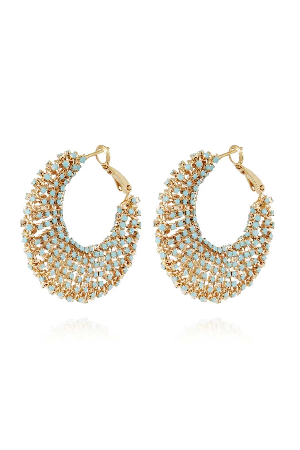 Izzia gold-plated hoop earrings adorned with delicate rhinestones that finely encircle the entire structure of the earring.