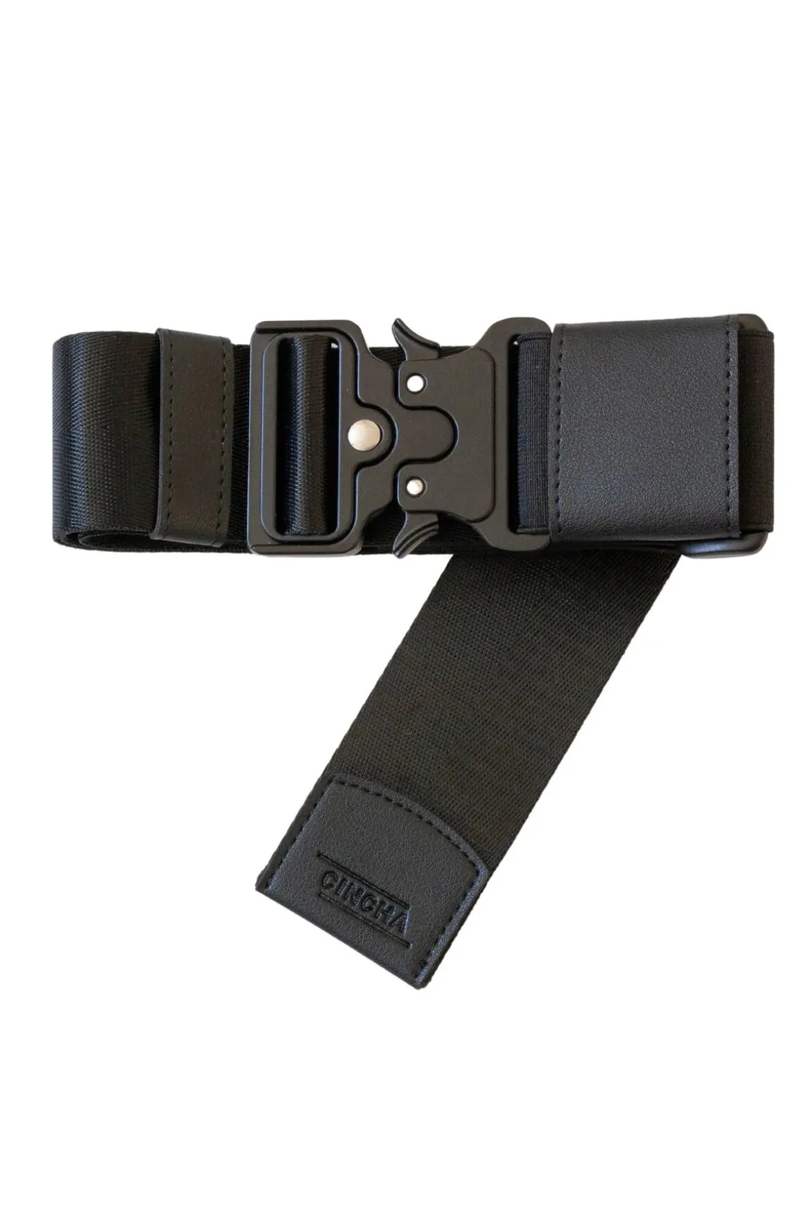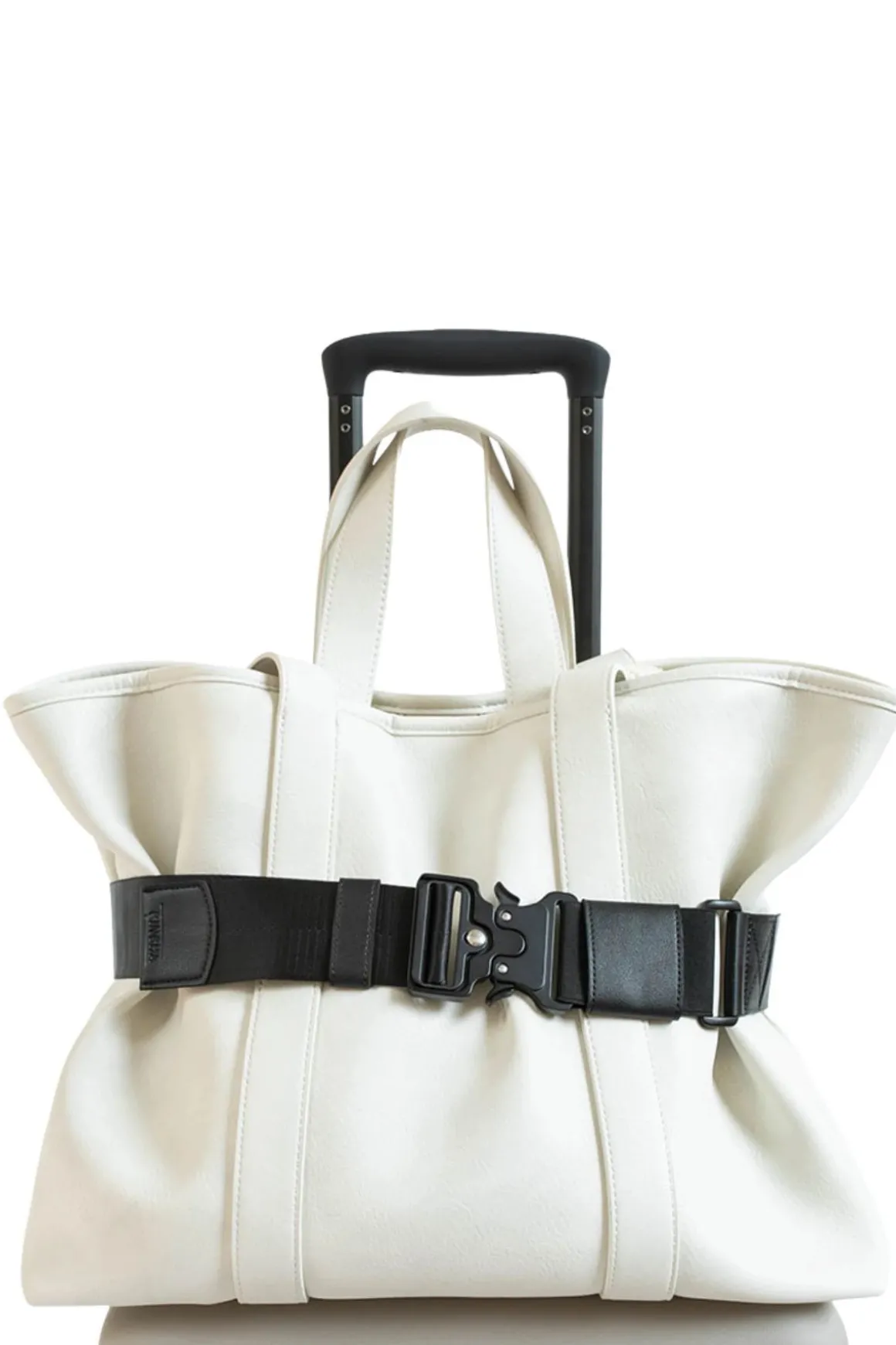 A travel belt that will keep your bag in place until you need it, featuring vegan leather and a herringbone patterned nylon. Offers a quick release buckle and an elastic fitter for an extra tight hold.