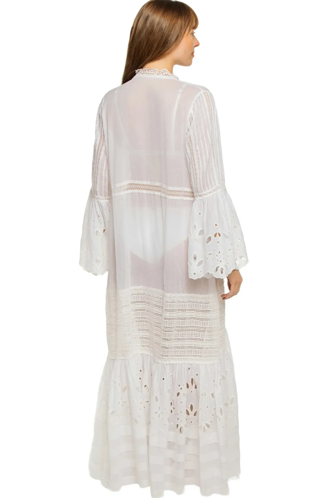 Jewel kimono features intricately designed lace trim, eyelet cut-outs and flounce sleeves.