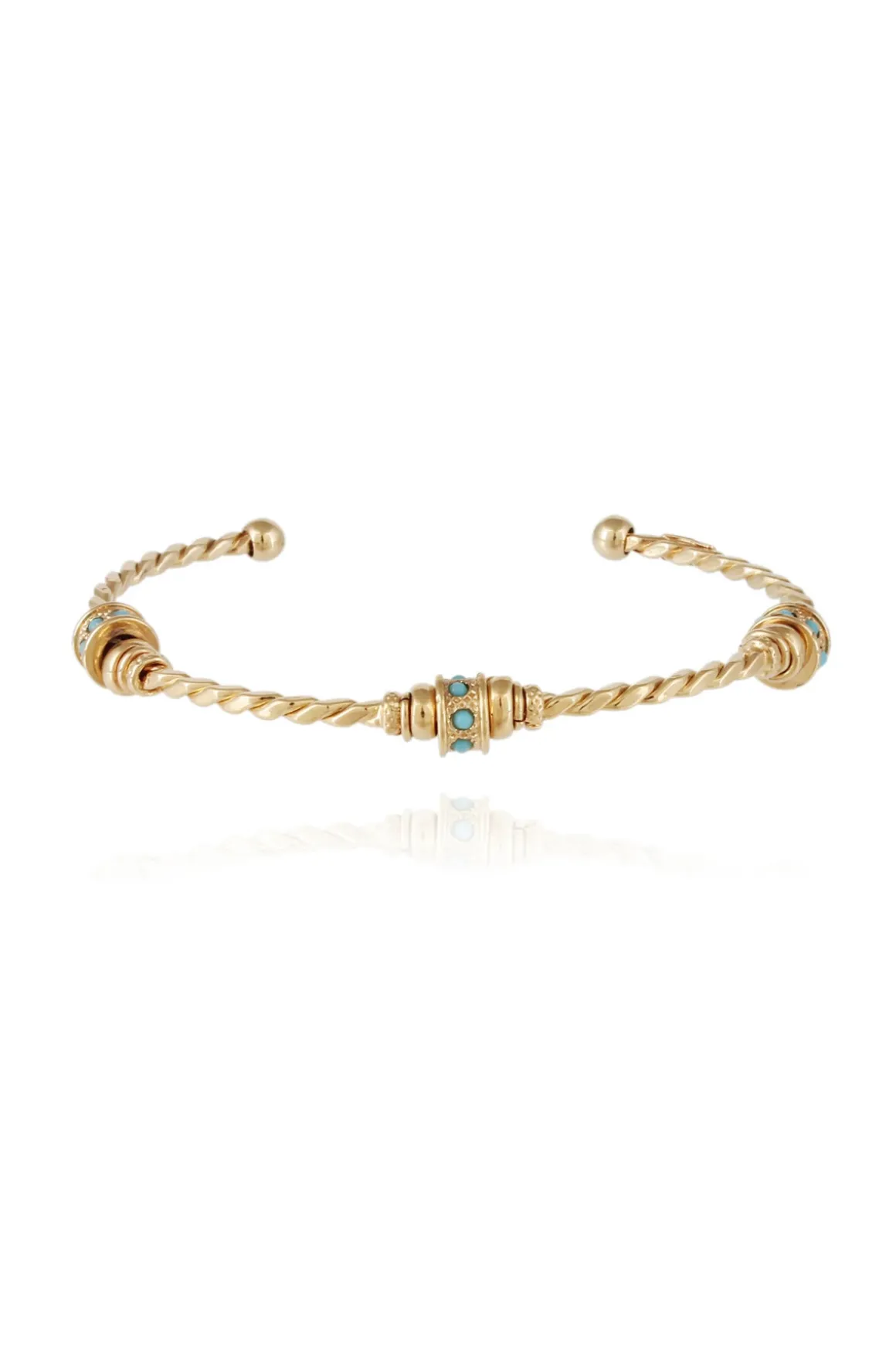 Gold plated twisted bangle adorned with strass rings and metallic threads.Features blue apatite stones. Adjustable size.