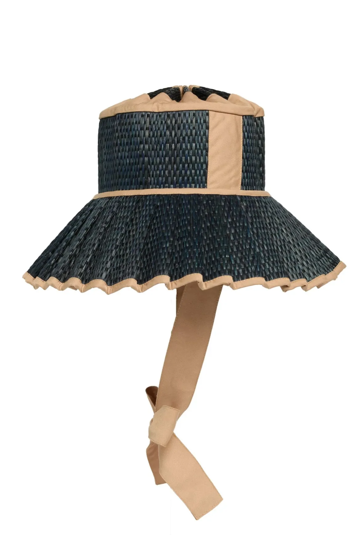Kapolei Ravello sun hat features a mid-length brim, is carefully handcrafted from 100% natural organic grass fibers, and is specifically designed to collapse and fold like origami due to the sunray pleats for easy packing and traveling. It offers wide ties at the base to anchor it during breezes. This stunning piece is created with ink-black threads woven through liquorice black grass fibers, while the caramel neutral cotton fabric trim elevates its design.