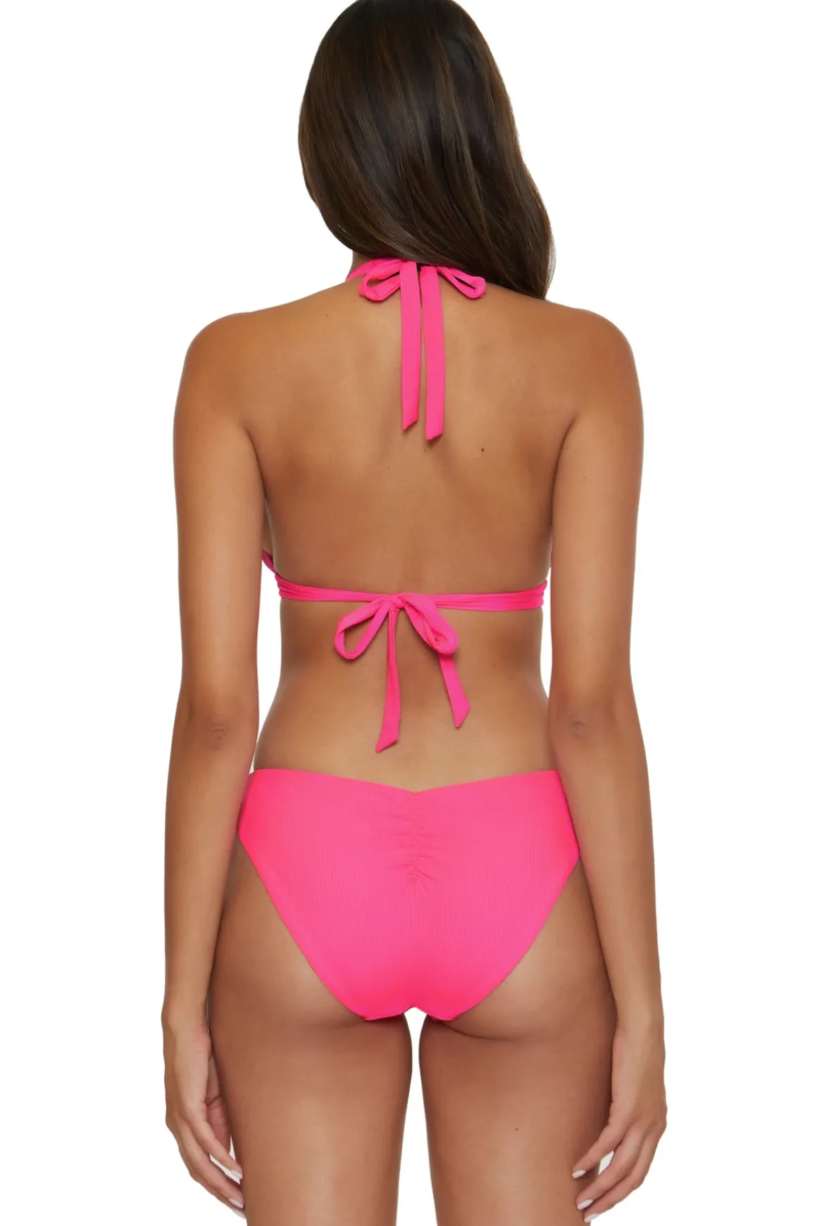 Keira bikini top features a ribbed texture with corset lace up ties and offers removable cups with adjustable ties at neck and back.