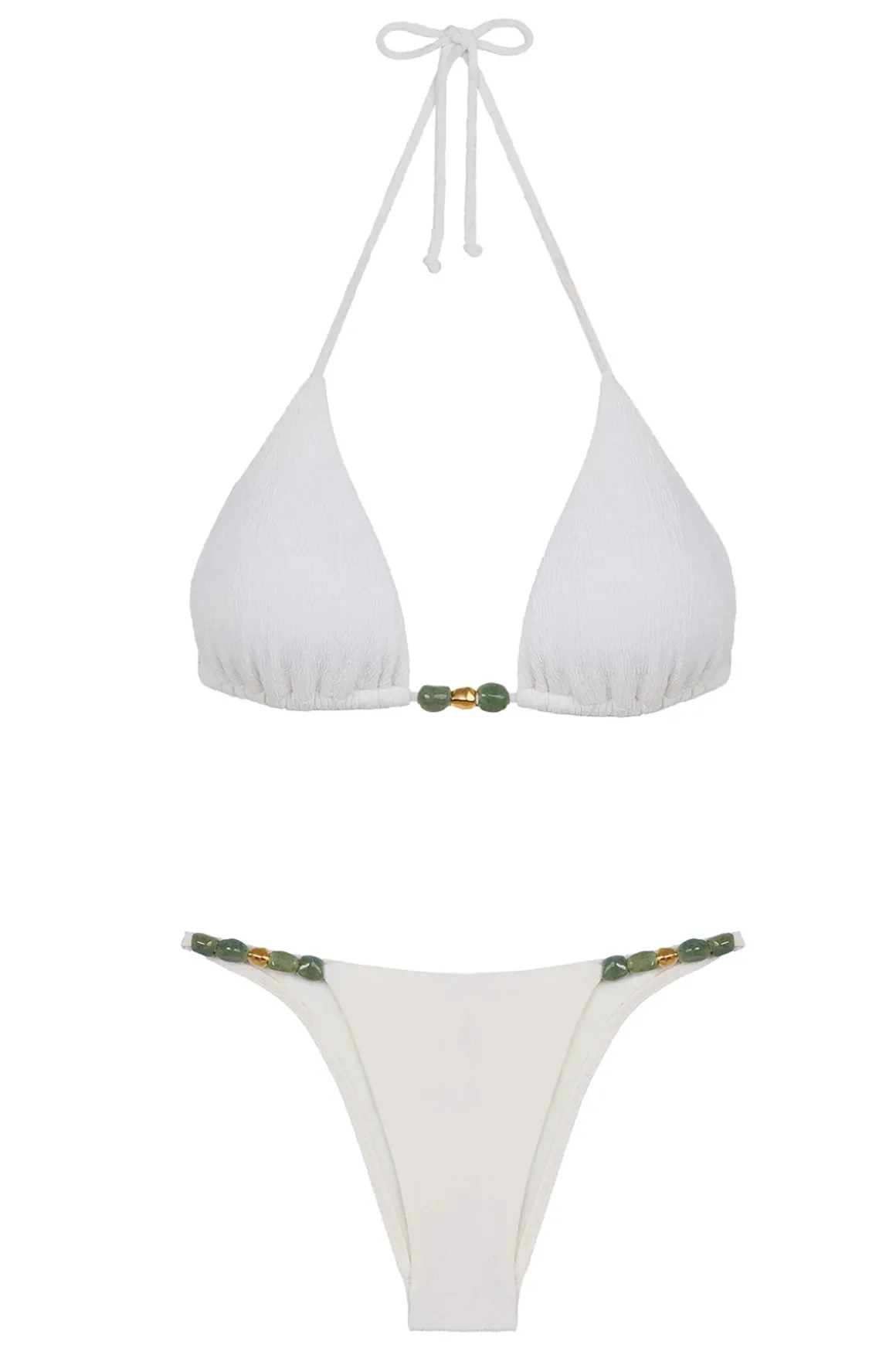 Crinkle textured bottom features gold-plated beads and jade color stones. Offers moderate bottom coverage.