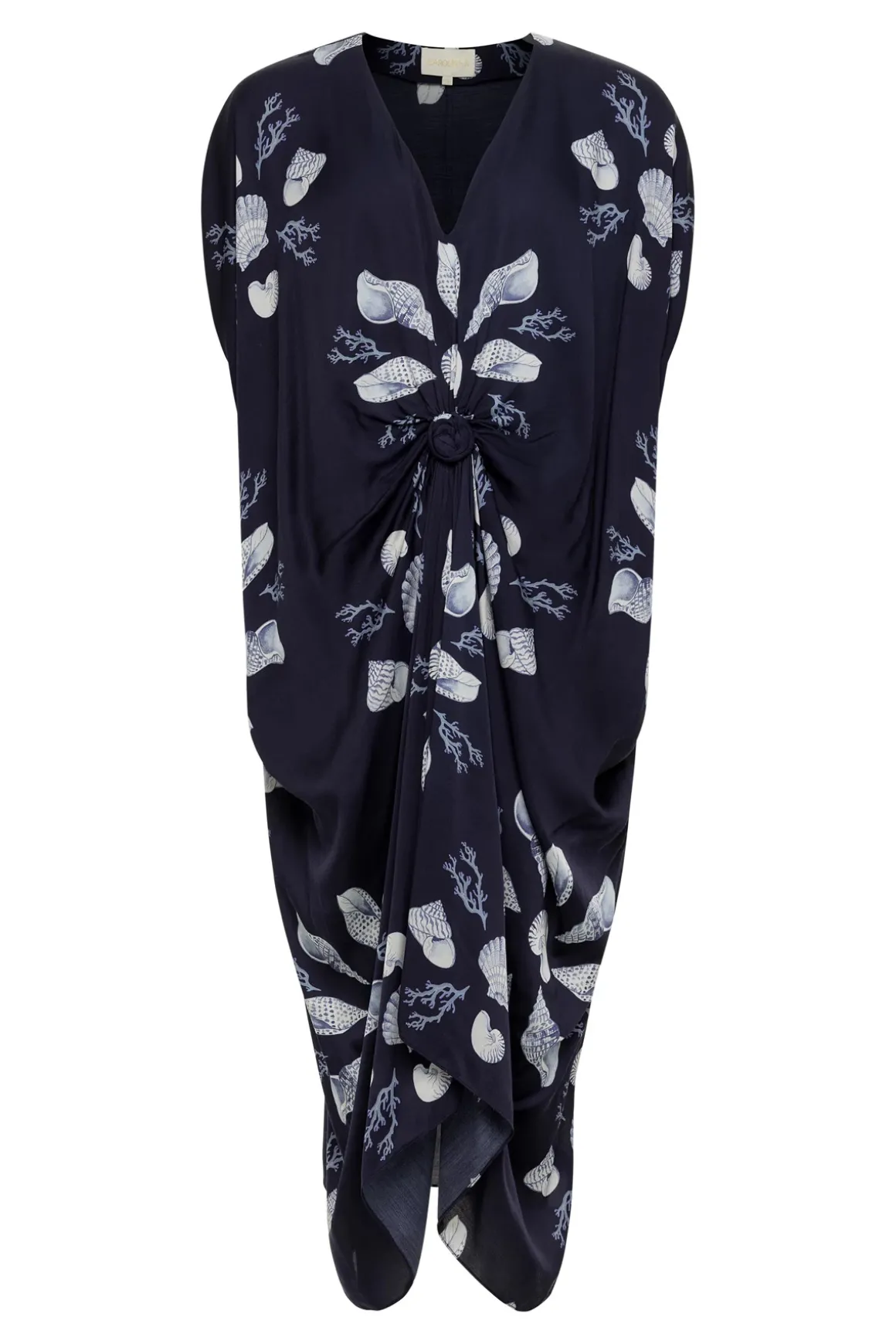Maxi caftan features, v-neckline, gathered handmade knot detail at waist, and short sleeves.
