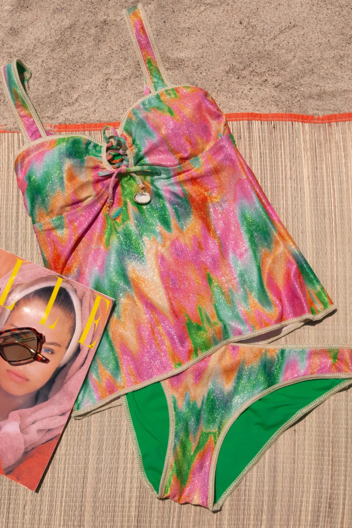 Kylam tankini top features shimmer fabric, threaded edge stitching and plunge neckline with lace-up ties adorned with shells. Offers removable soft cups and adjustable straps.