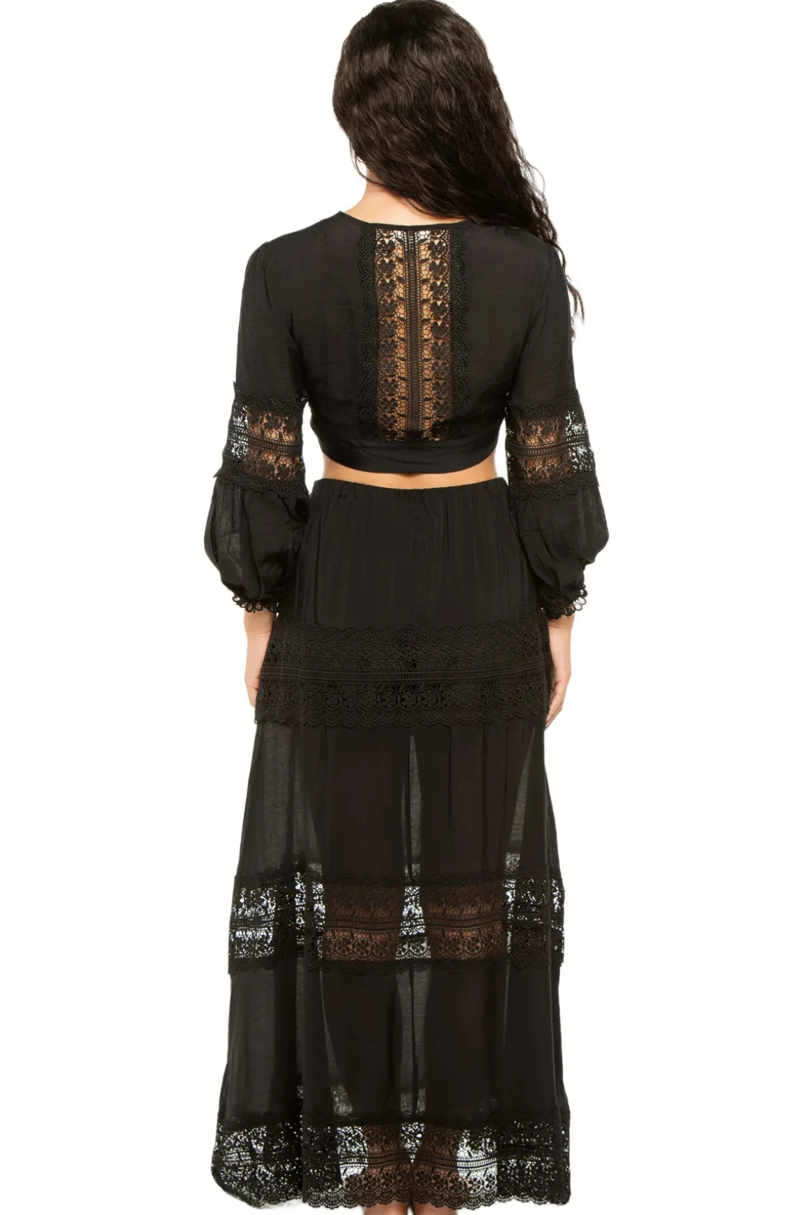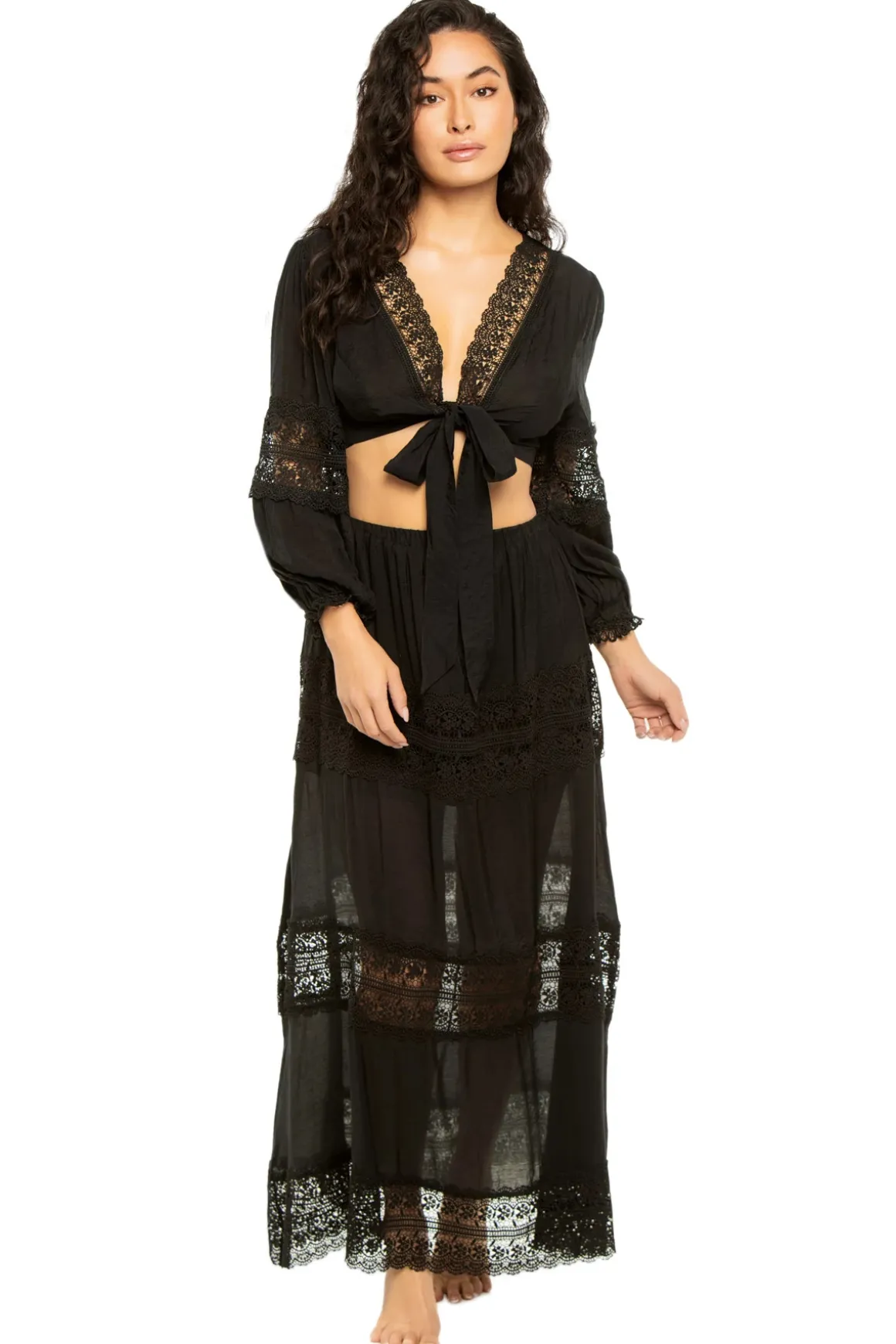 Crop top features lace embellishments and long sleeves with ruffle trim Offers a tie front closure.