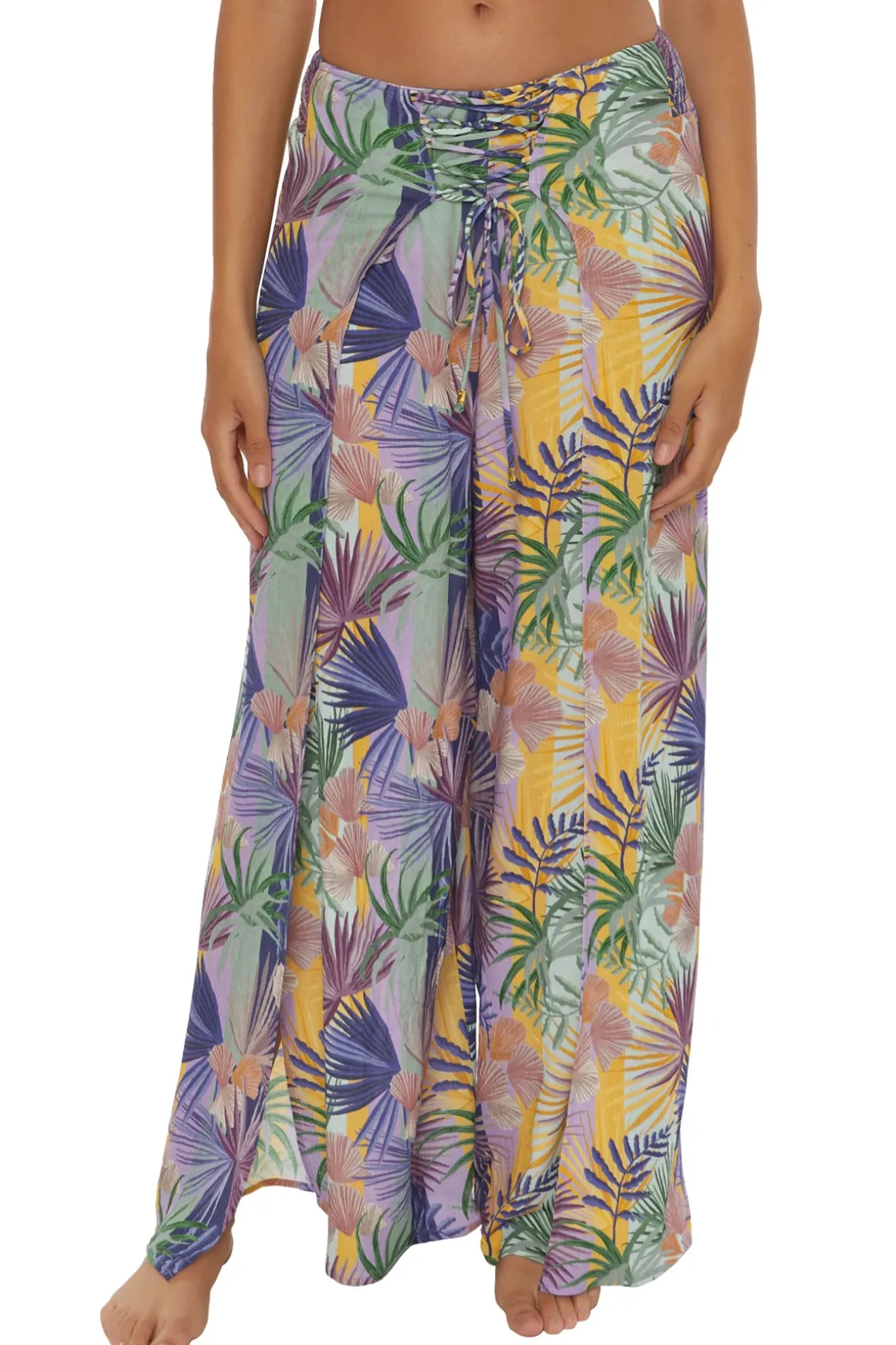 Botanical pants feature a lace-up front with bead detail, wrap legs with slit openings and a smocked back waist.