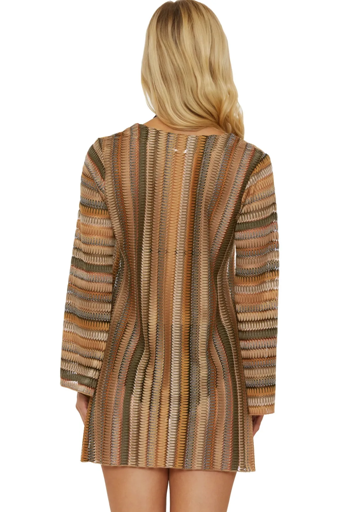 Tunic features crochet knit with a lace-up front neckline and offers long bell sleeves.