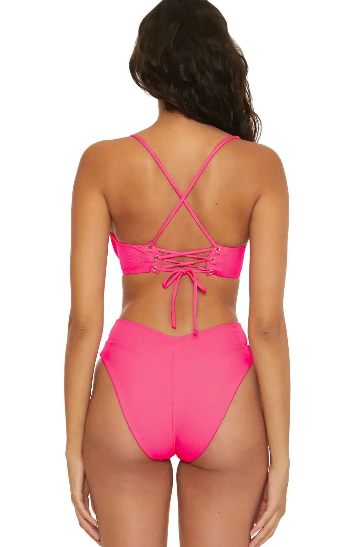 Lana bikini top features a ribbed texture with a sweetheart neckline and offers removable cups, supportive underwire and a corset lace up back.